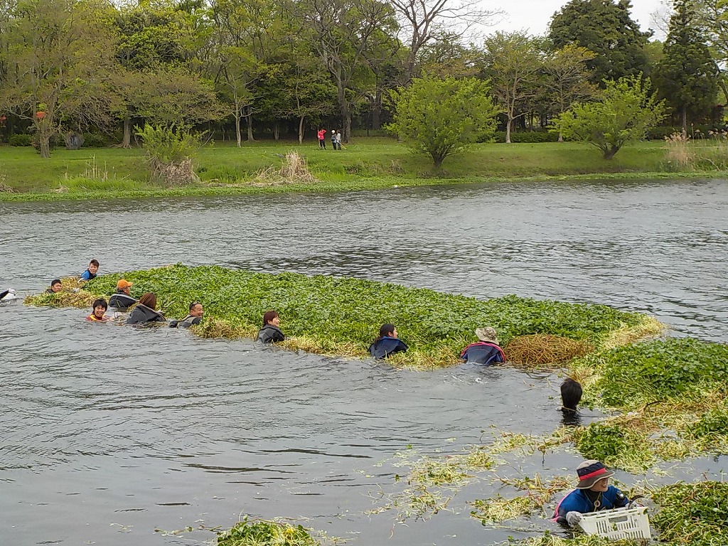 どこからともなく流れてくるプラスチックごみや、繁茂したブラジルチドメグサを中心とした外来水生植物。