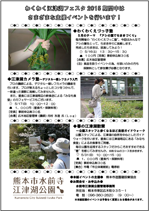 また、5月には「わくわくえづっ子塾~アシの葉でちまき作り」、「江津湖カメラ塾~デジタル一眼レフカメラ入門」、「春の江津湖散策~公園スタッフと歩くなるほど自然ガイドウォーク」など、様々なイベントも開催します。この3つのイベントにつきましては事前申込制となりますので、興味がある方は、ぜひお問い合わせください。