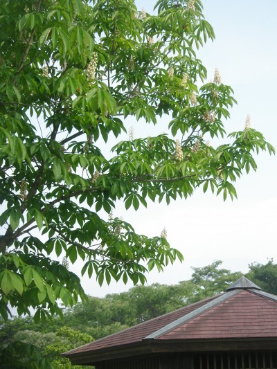 昨日ご紹介した旧有吉邸のセンダンから、芝生広場を挟んだ反対側にトチノキがあり、こちらも