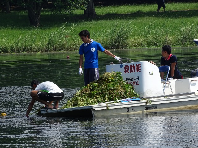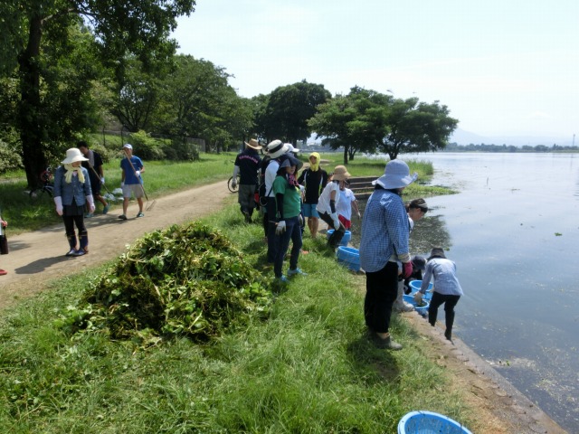 今日は、下江津湖を中心にボート競技の練習を行っている「熊本県ボート協会」の皆さん及び一緒にご協力いただく「肥後東ライオンズクラブ」「熊本市造園建設業協会」の皆さんに下江津湖の水草清掃を行ってくださいました。