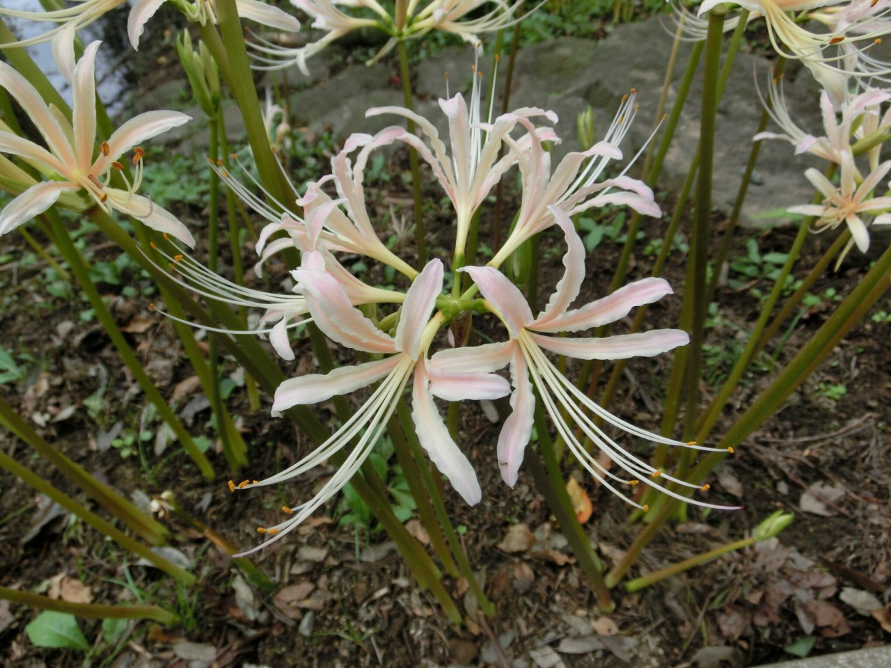 見た目はヒガンバナ、でも色だけでなく花の形も少し違うような…と思い、調べてみたところショウキズイセンとヒガンバナの交雑から生まれた「シロバナマンジュシャゲ」というようです。ちなみに、「リコリス」「シロバナヒガンバナ」とも呼ばれています。