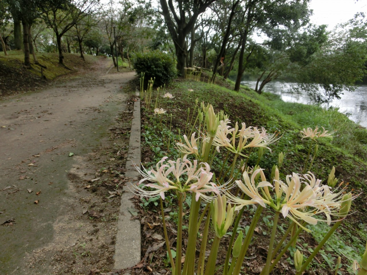 9/5の記事では赤い「ヒガンバナ」の開花をご紹介しました。そして今日は、画図橋(動植物園西)~江津斉藤橋(東バイパス)にかけての遊歩道で白いヒガンバナのような花が咲いていました。
