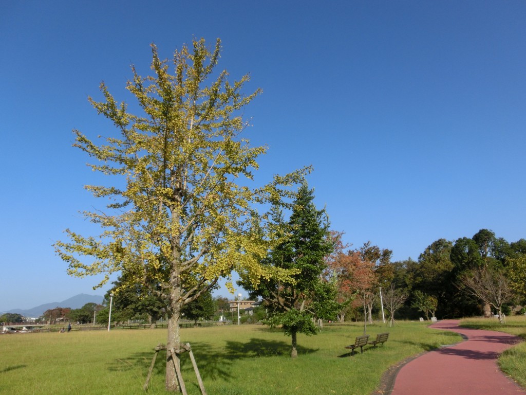 一方、上江津湖側ではここ数日歩いてみると、10月上旬の頃と比べ木々の葉が色づきはじめ、「少しずつ紅葉が始まってきたな」と感じるようになりました。