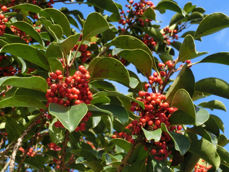 クロガネモチはモチノキ科の植物で、都市環境にも耐えられることから、公園の木や街路樹として用いられています。また、この赤い実を野鳥が食べ、その糞によって様々な場所に広がっていくようです。
