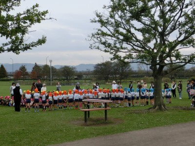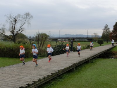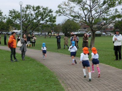 今日は、YMCA水前寺幼稚園のこども達によるマラソン大会が広木地区で行われ、約40人のこども達が広木地区の管理棟近くの園路を2周、1キロ強のコースを元気に完走しました。