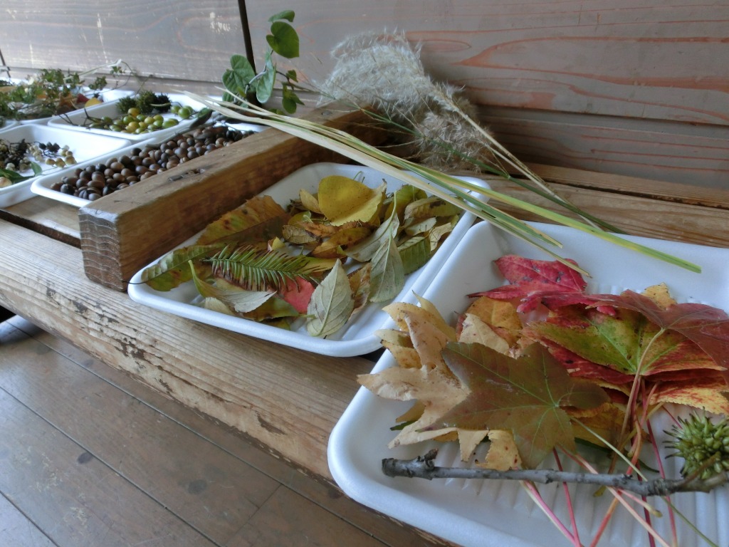 いろいろな色や形の葉っぱ、目になる実など、たくさんの材料を集めました。