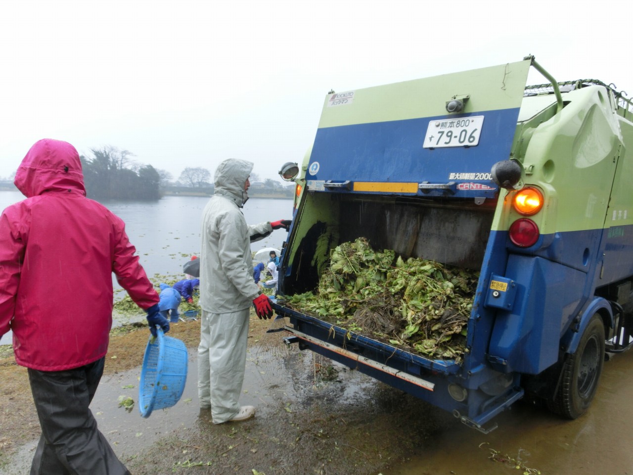 参加者はみなさんカッパ姿で一生懸命に水際に集められた水草をカゴに入れ、収集車に積み込んでいきます。文章にすると単純に見えますが、水を含んだ水草はとても重いため、かなり大変な作業をしていただきました。