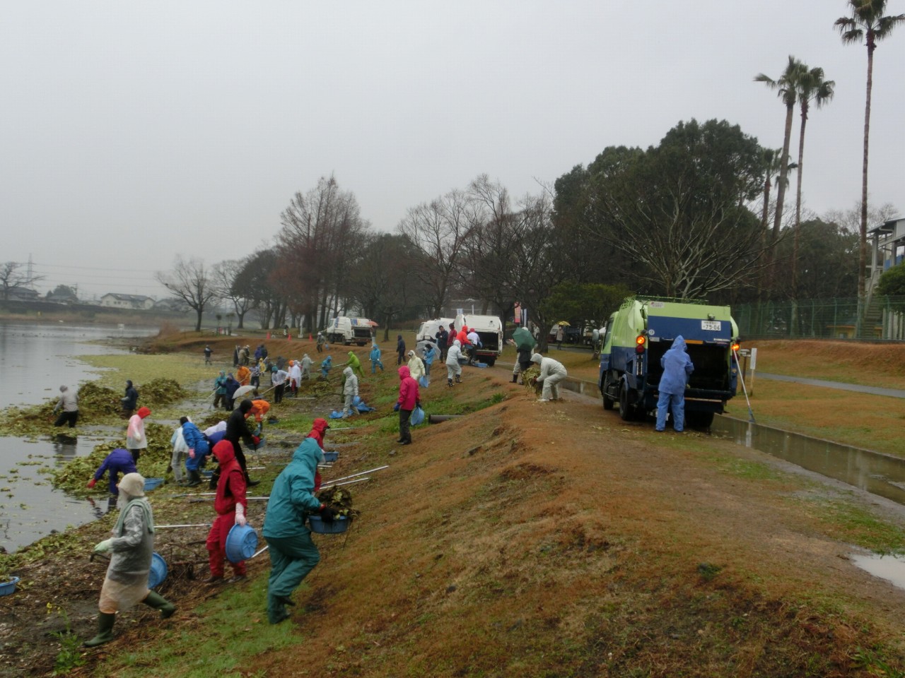 今日は下江津湖の動植物園沿いにて、「みんなで江津湖の外来水草を退治しよう!」と題したボランティア清掃活動を行いました。