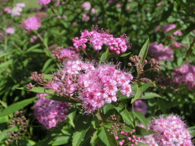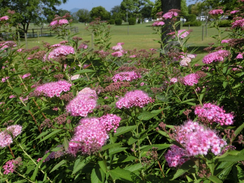 下江津湖の広木地区の園路沿いで、シモツケの花が見ごろをむかえています。