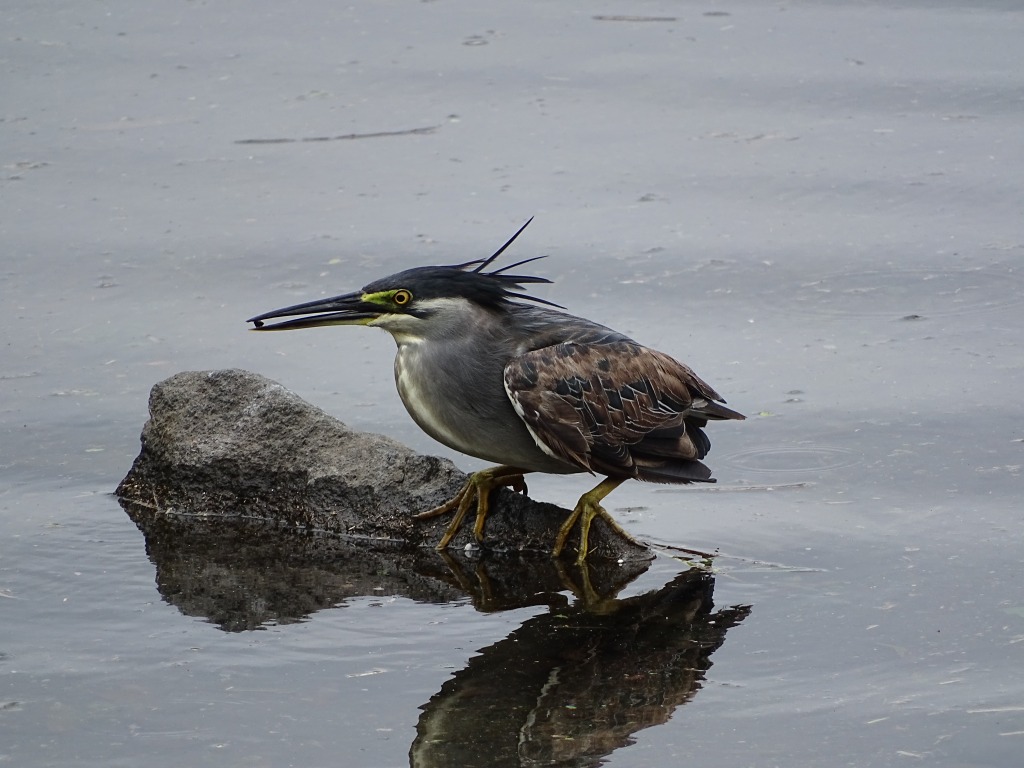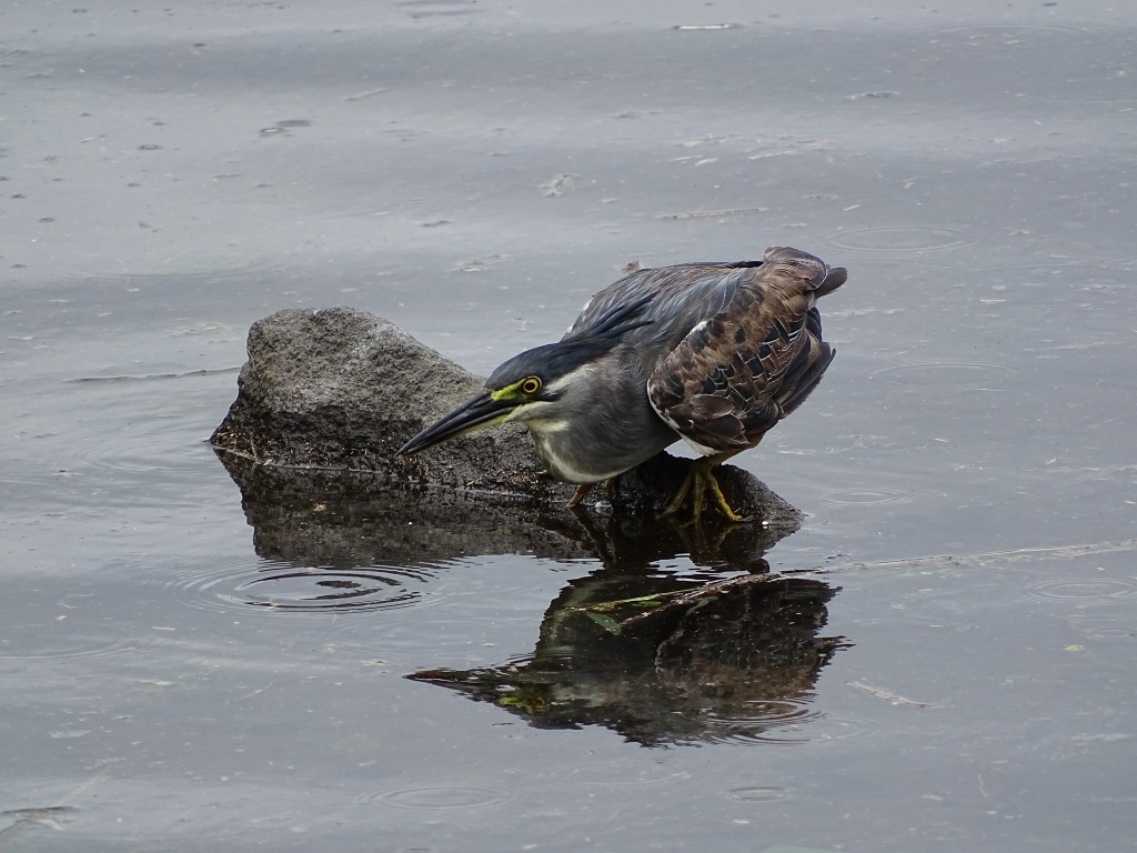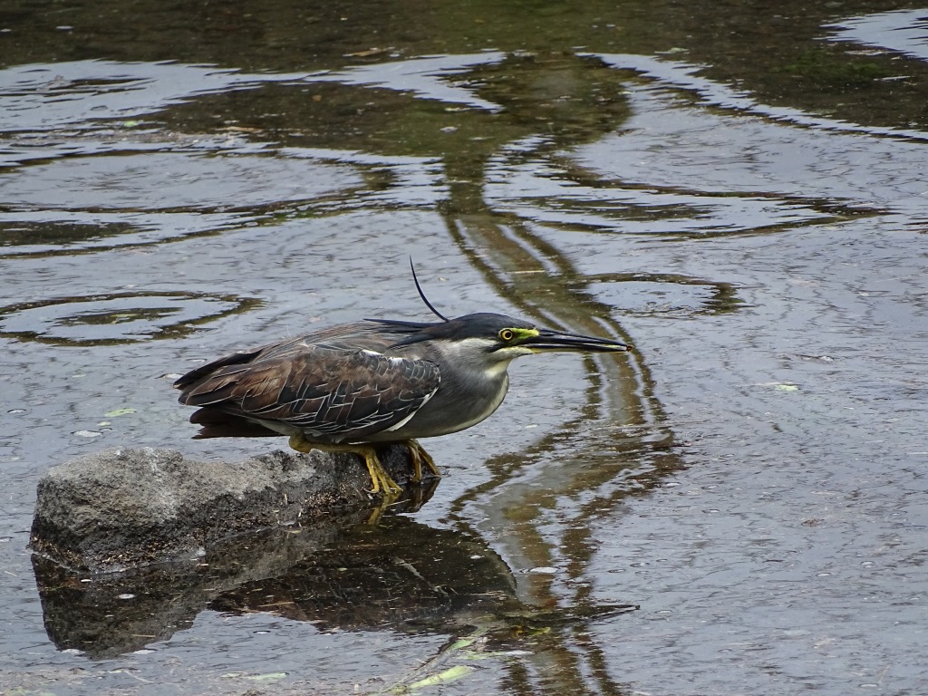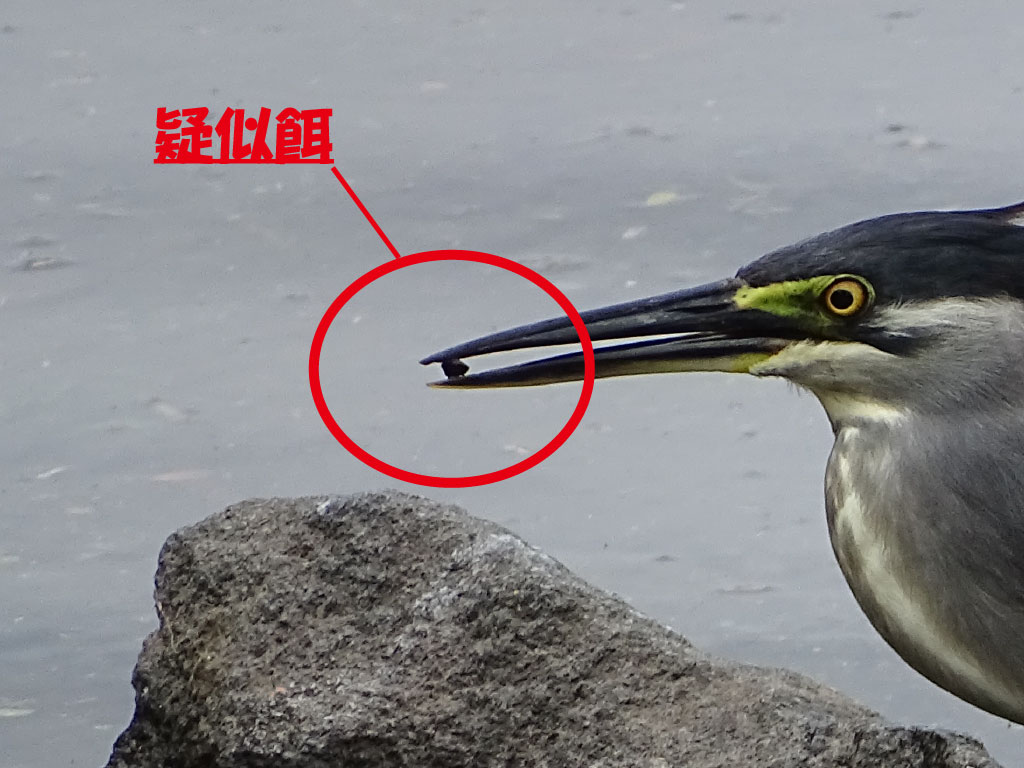 なぜ江津湖のササゴイが全国で有名かといいますと、江津湖のササゴイは疑似餌を使った漁をするからなのです(最初にその様子を撮影されたのが水前寺公園だといわれています)。疑似餌漁とは、葉っぱなどを虫に見立てて水面に浮かべ、よってくる魚を捕まえることです。