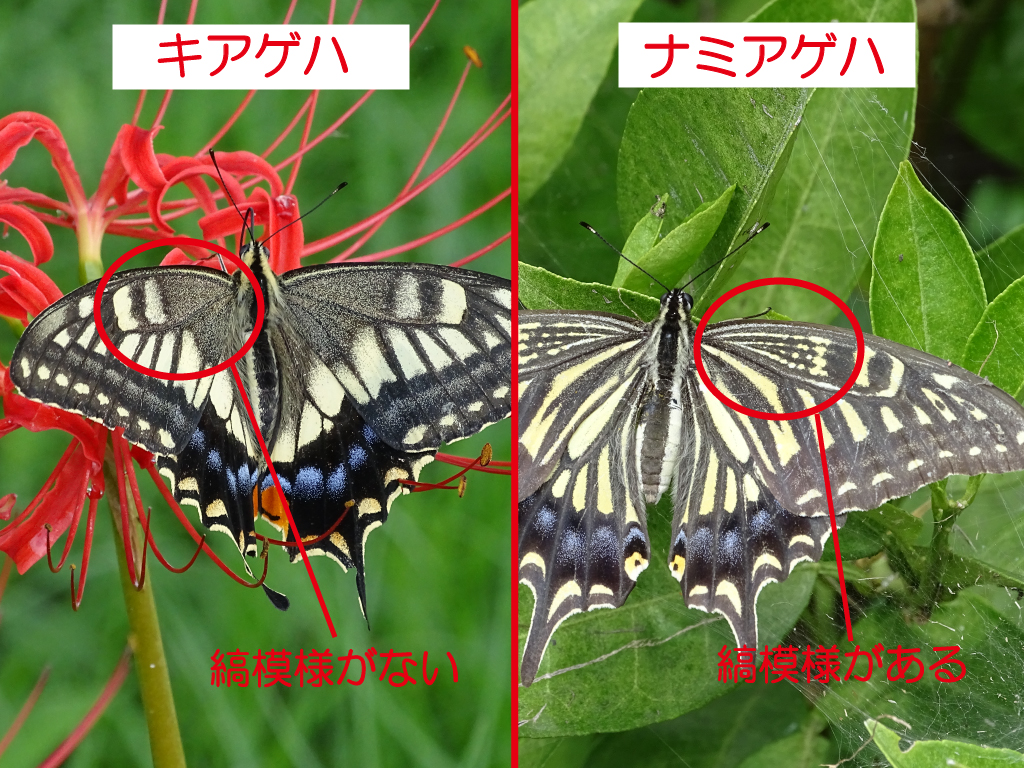 よくいるナミアゲハに似ていますが、翅の付け根の模様で区別できます。