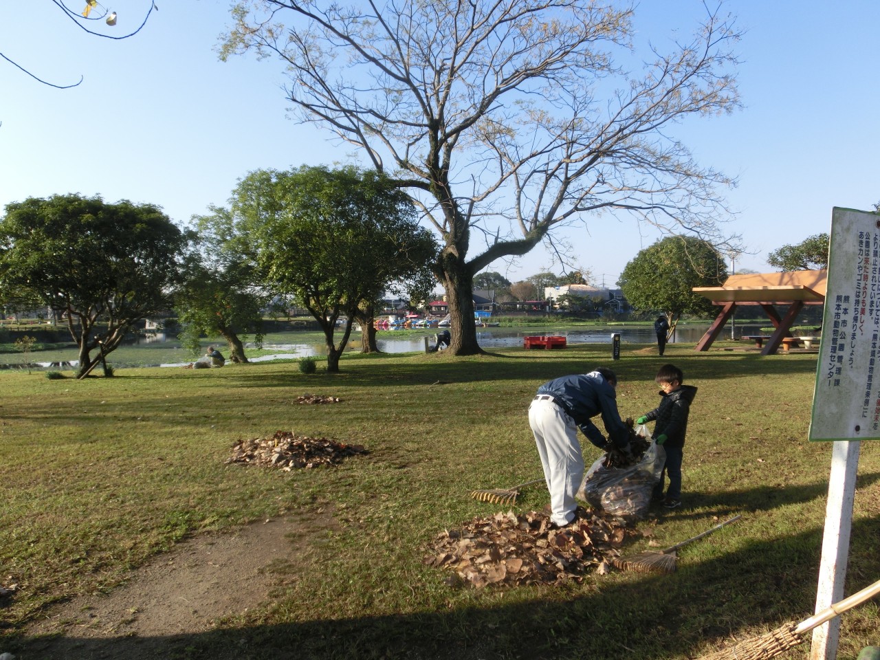 先週までの暖かい日から一変、この日は気温5℃の寒い中集まって行われました。江津湖は11月下旬ごろから本格的な紅葉・落葉のシーズンを迎え、園内の様々なところで美しい風景を楽しめるものの、その後には膨大な量の落ち葉が園路を覆います。