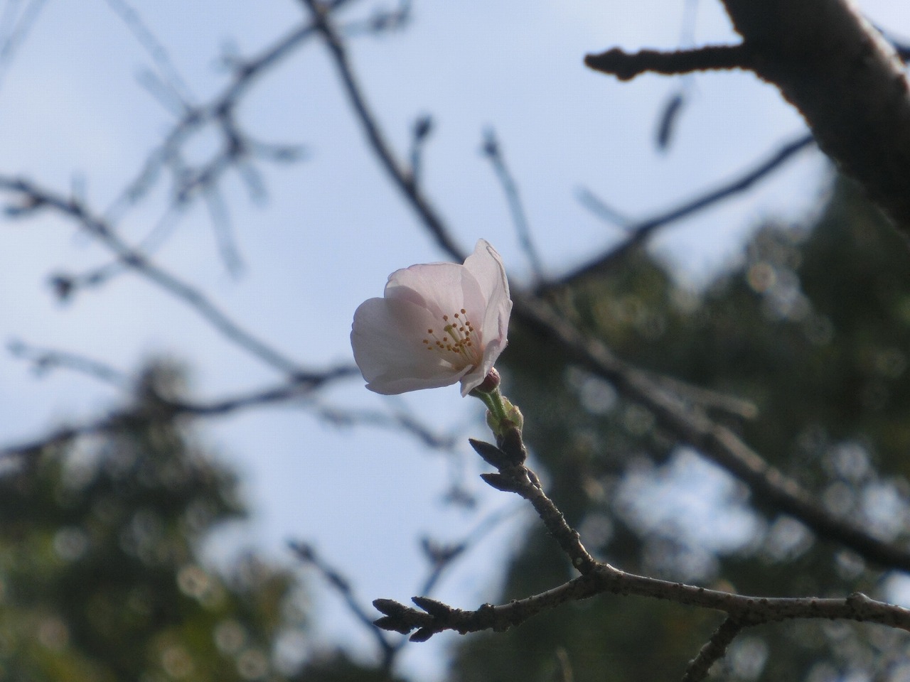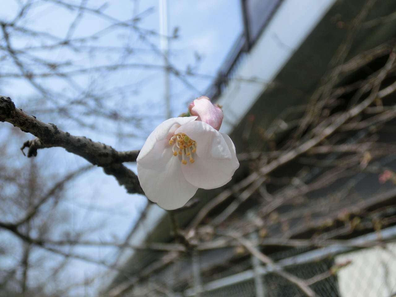 片付けも終わり、下江津湖を巡視していると、かねてより注目していた江津斎藤橋の真下にあるサクラ(ソメイヨシノ)が開花しているのを見つけました。