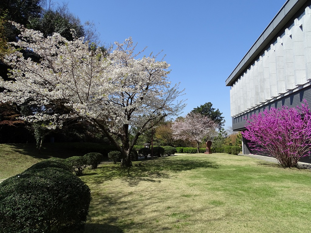 県立図書館裏のオオシマザクラ(写真手前の白い花びらのサクラ)は見ごろを迎えています。