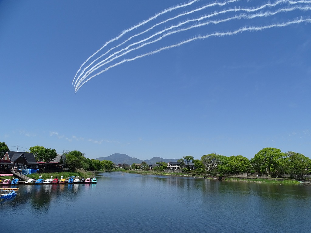 今日はよい天気の江津湖となっています。今日熊本市内では、熊本地震復興支援のブルーインパルス飛行が行われました。