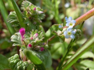 赤いホトケノザと青いキュウリグサ。近くにタンポポでもあれば信号機になったのですが・・・