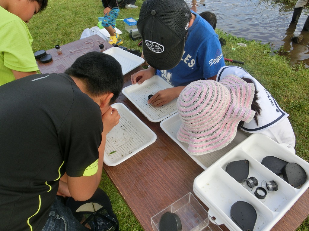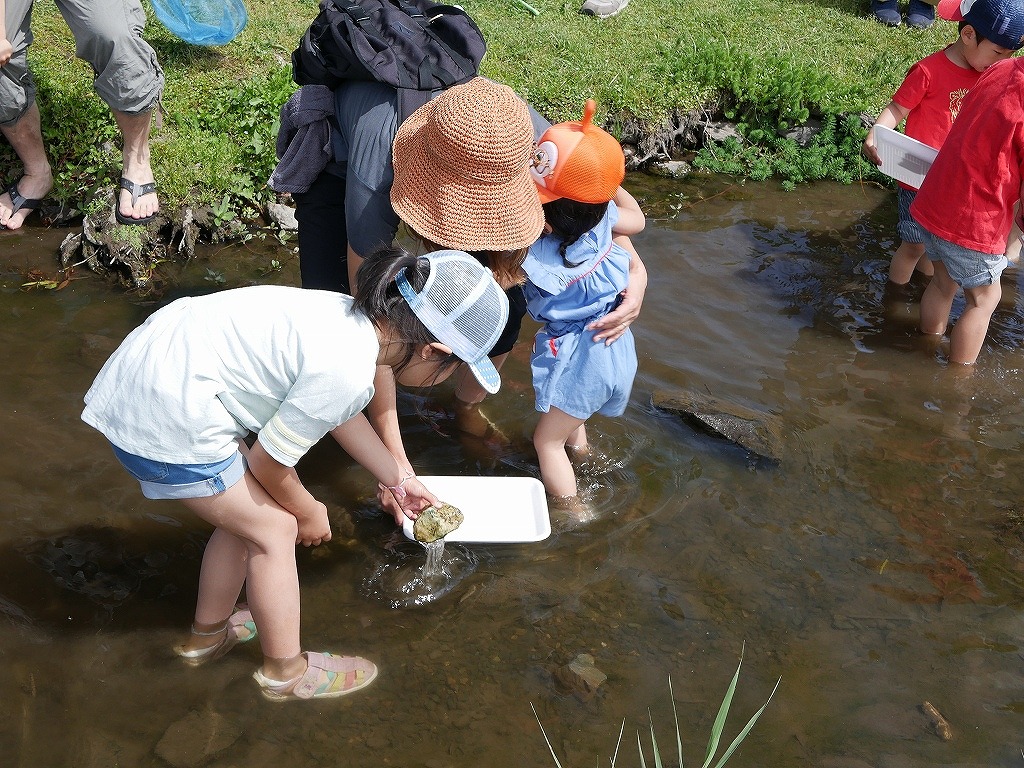 石の裏の小さな生きものを探したり、藻の中のエビやザリガニを探したりと、みんな一生懸命でした。