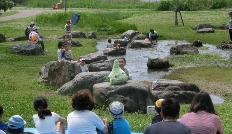 昨年4月の震災後、「地震やそれに伴う避難でストレスを抱えているこども達に、少しでも笑顔になってほしい」との思いから、スロベニアで人形劇創作活動をされている美月泉(みつき いずみ)さんを中心に様々な方が集まり、『あそびのいずみ』と題して水遊び広場周辺で震災ボランティア活動として人形劇などを披露してくださいました。また、この時開催した「あそびのいずみ」は、昨年末に一般財団法人 公園財団が主催する「夢プラン大賞2017」の《実現した夢部門》でも入選されました。