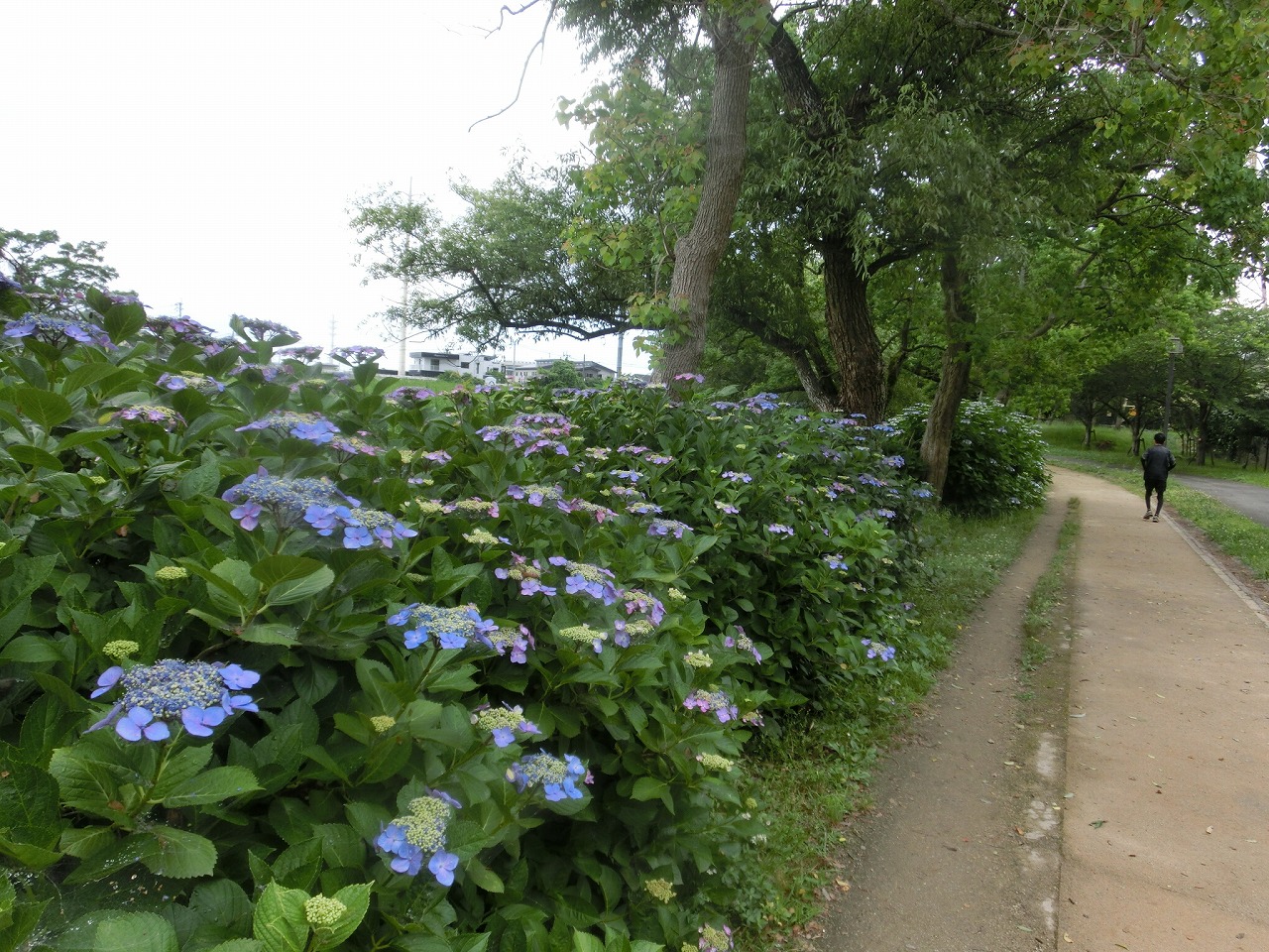 梅雨に入ったとはいえ、今日はスッキリと晴れた朝を迎えました。下江津湖を巡視してみると、アジサイやガクアジサイが園内の散歩道を彩ってくれています。ところで、このブログではアジサイを「ご覧いただけます」「おすすめです」と表現し、わざと「開花しました」とは書きません。