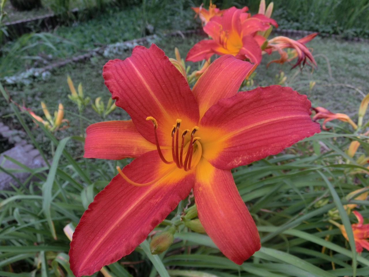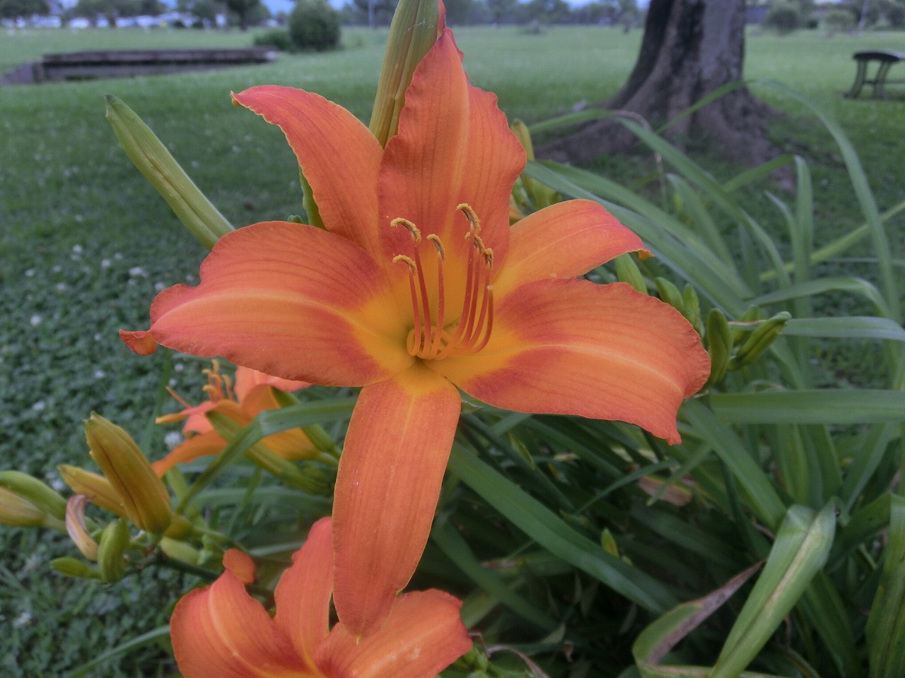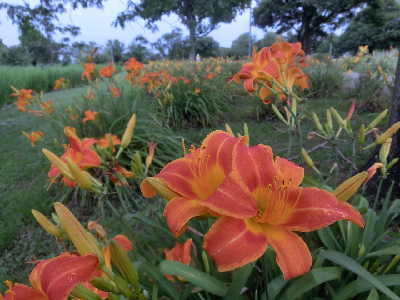 広木地区の湖側では、今年もヘメロカリスが開花してオレンジ色の花々が園路を彩ってくれています。