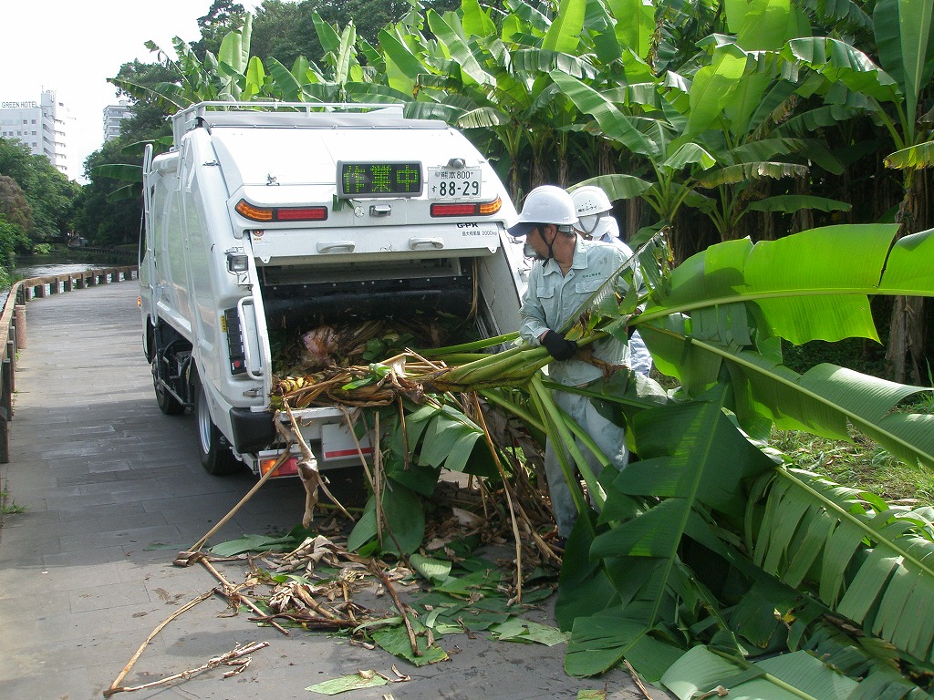 芭蕉園のバショウは、この時期になると日光と雨を受けぐんぐん成長します。バショウが覆い茂ると、せっかくのきれいな水辺なども見えづらく景観的にもよくないため、見通しを良くするため剪定・伐採を行います。