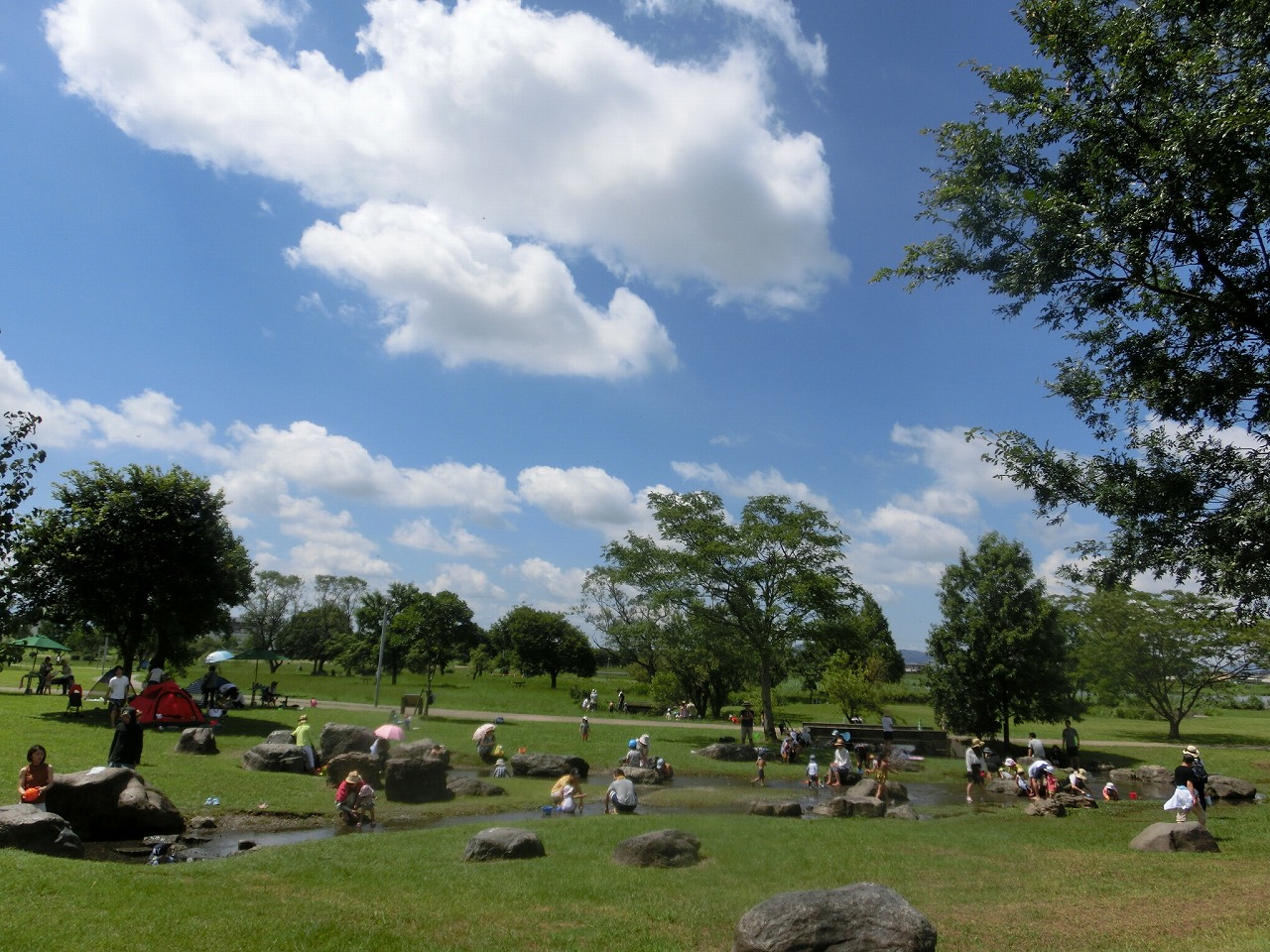 今日(7/17)は海の日。江津湖では「海」に直接関連するイベントは行っていませんが、この暑さで園内各地の水遊び広場がにぎわい、親子連れだけでなく中学生や高校生も涼を求めて江津湖に集まってきています。