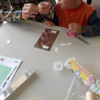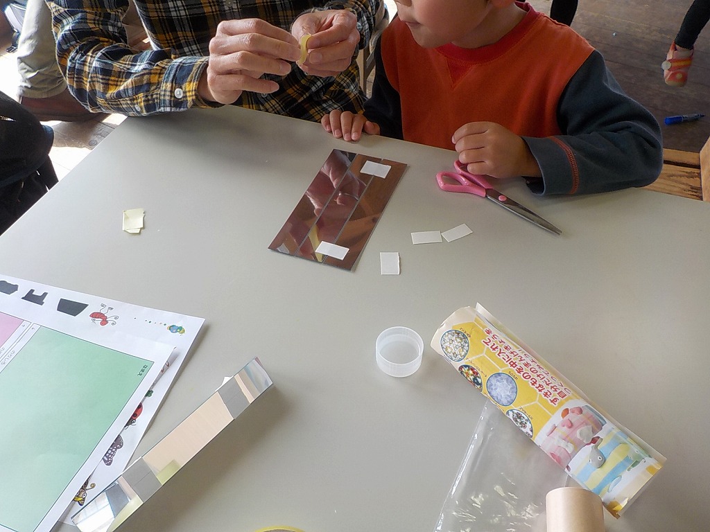 まず最初に、参加者の皆さんには万華鏡をつくってもらいます。絵を描いたり貼ったりして、オリジナルの万華鏡をつくります。