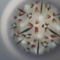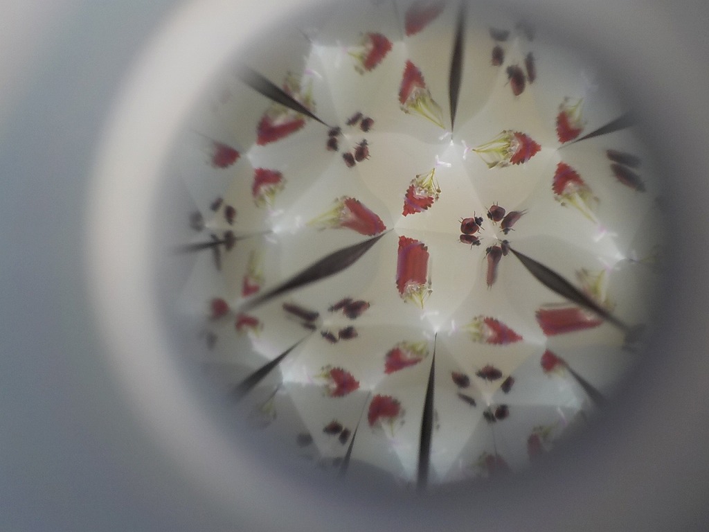 万華鏡をきれいに見せるコツは、いろいろな色の花を使うことです。中身の花をさがすために、いつもは目につかない小さな花にも目が行きます。小さな花を見つけることで、春を感じていただけたらと思います。