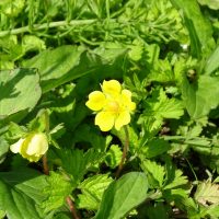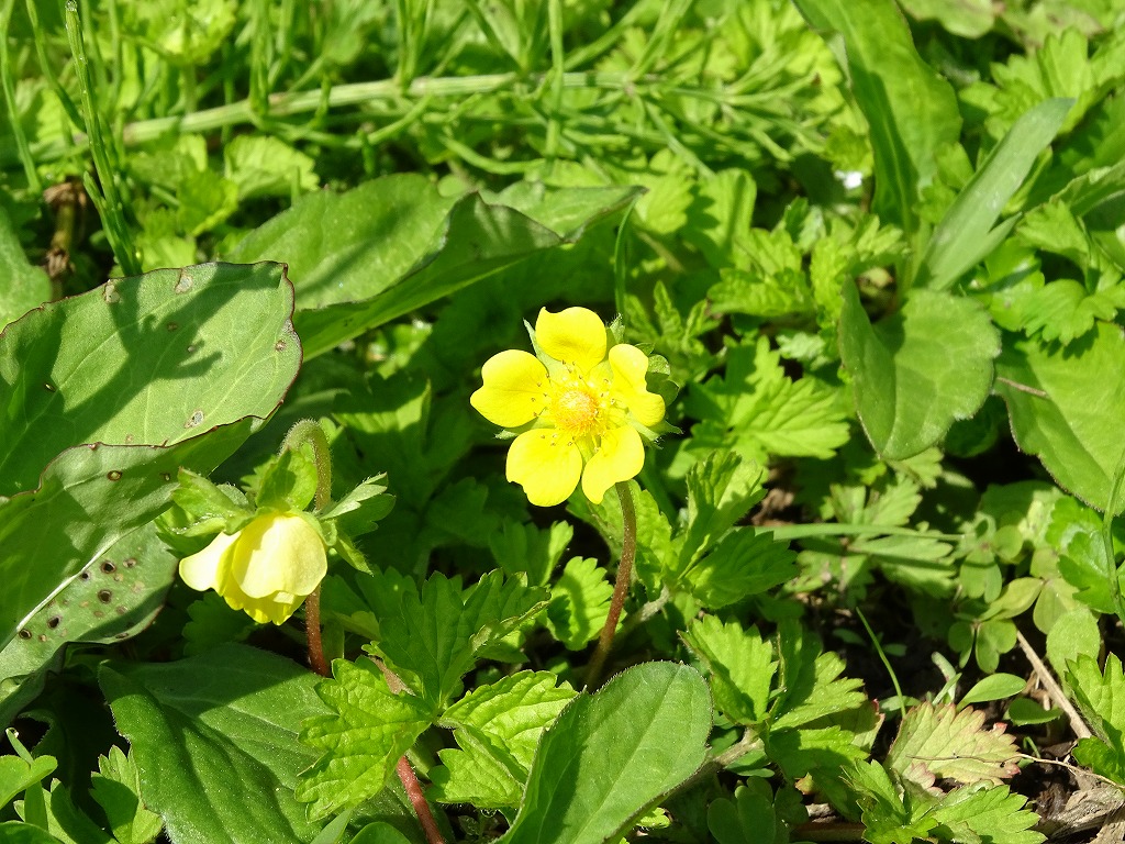 ヘビイチゴは地表を這うように花をつけます。オヘビイチゴなど、よく似た花があります。バラ科の植物です。