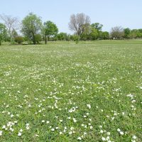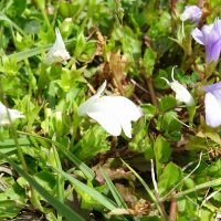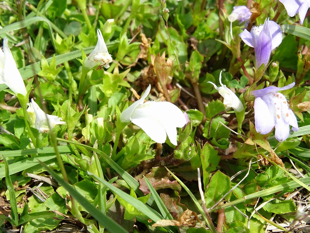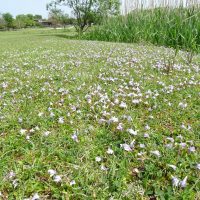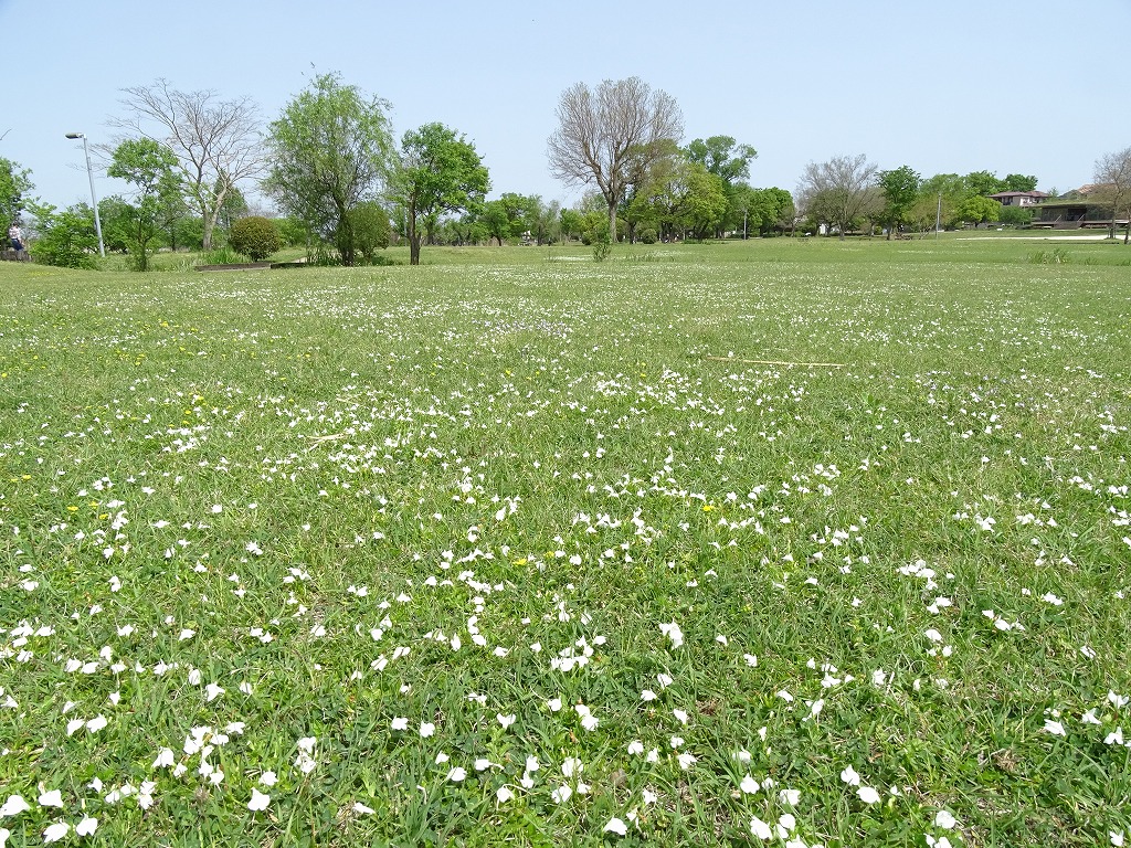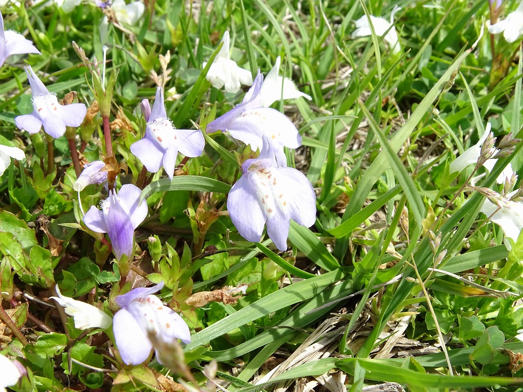 園内では、色とりどりの花が咲き始めています。一部では紫や白のじゅうたんが見られます。サギゴケの花々です。
