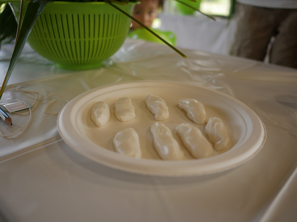戻ったらいよいよちまきづくり。今回はちまき用の粉40g、砂糖10g、水30cc(※1人分)を混ぜて、大人の小指大の細長いお団子を6~7個作り、それぞれをアシの葉でつつんでからイグサで巻いていきます。