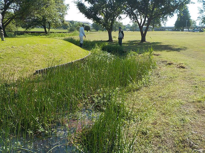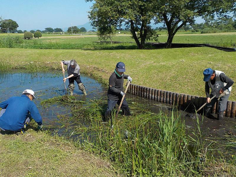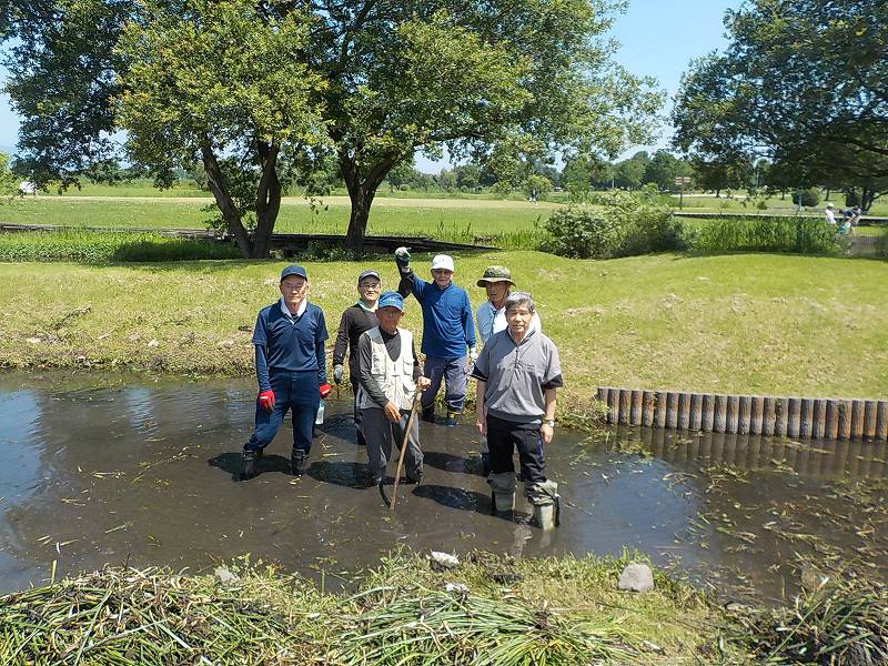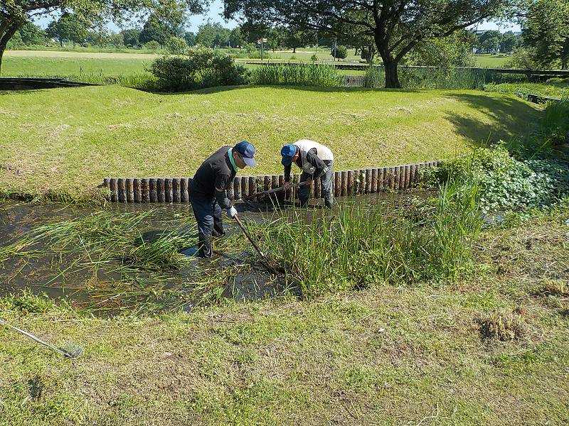 本日は、公園の花壇管理や希少植物の保全活動を行っているEZパートナーズの皆さんと一緒に、ミズアオイの保全作業を行いました。