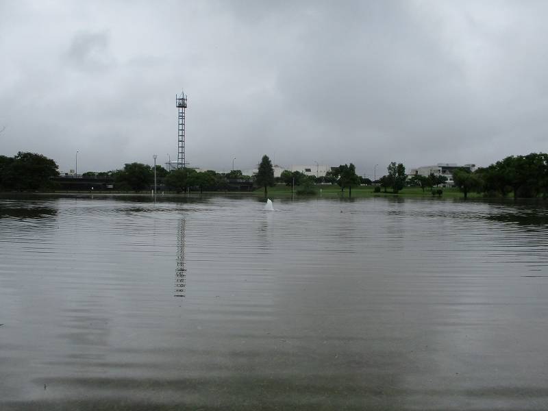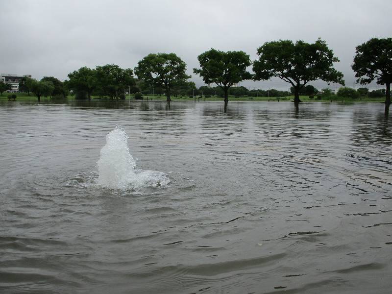 水前寺江津湖公園の一部は加勢川(江津湖)の氾濫を抑えるための緩衝地としての役割を持ち、今の時期にはこのように公園の一部が冠水してしまいます。