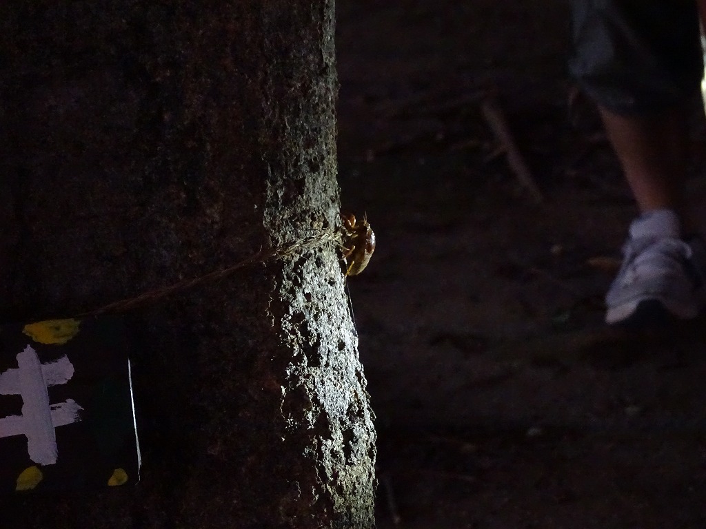 日が沈むと多くのセミの幼虫が出てきました。間違って踏まないように注意しながらの観察です。