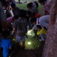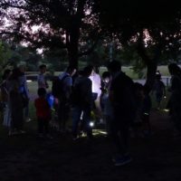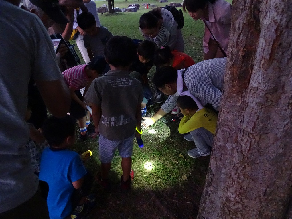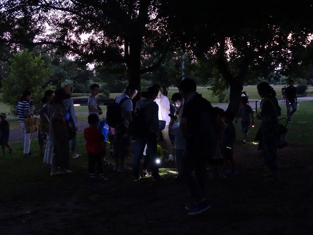 そして、いよいよ外での観察会です。暗いので懐中電灯を持っての観察となります。