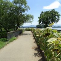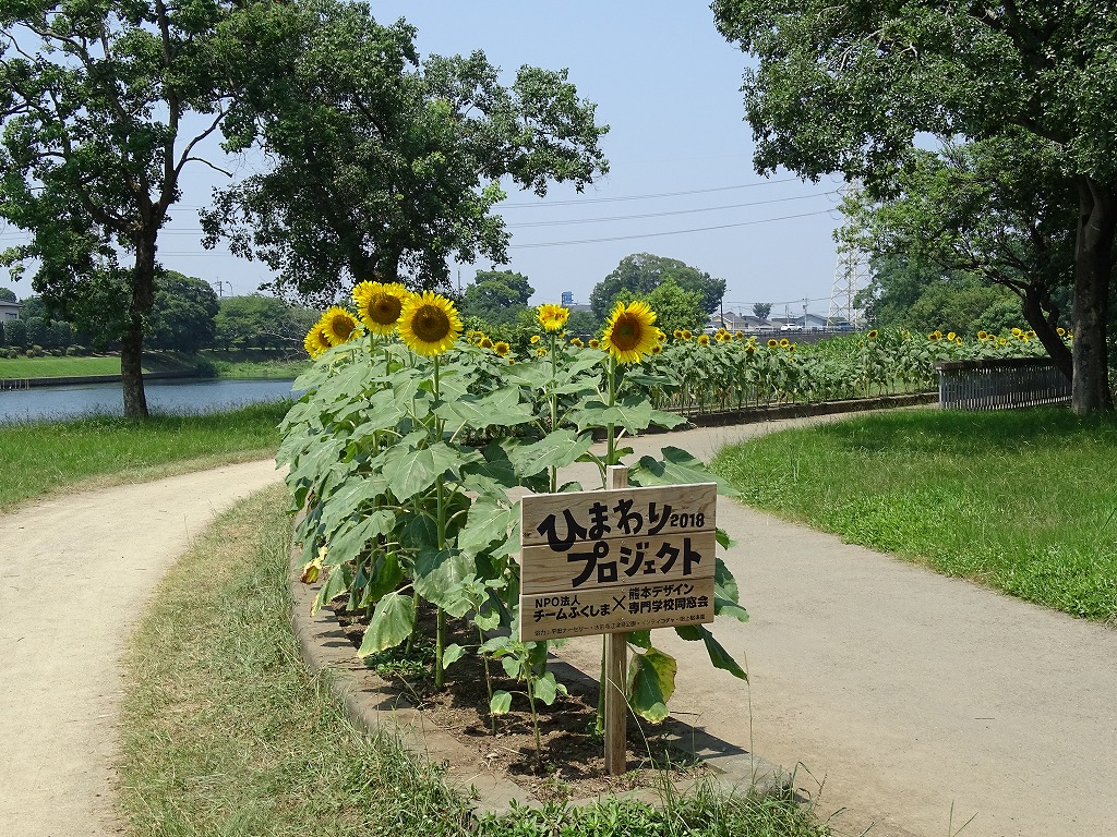 江津湖公園では、5月20日にヒマワリの種を下江津湖湖畔に植えました。これは東日本大震災の復興支援と、東日本大震災により大きな被害を受けた福島と全国との絆づくりを目的に実施している「福島ひまわり里親プロジェクト」の一環として実施したものです。主催は熊本デザイン専門学校同窓会、協力で平田ナーセリー、田上樹楽園、水前寺江津湖公園サービスセンターが参加しました。