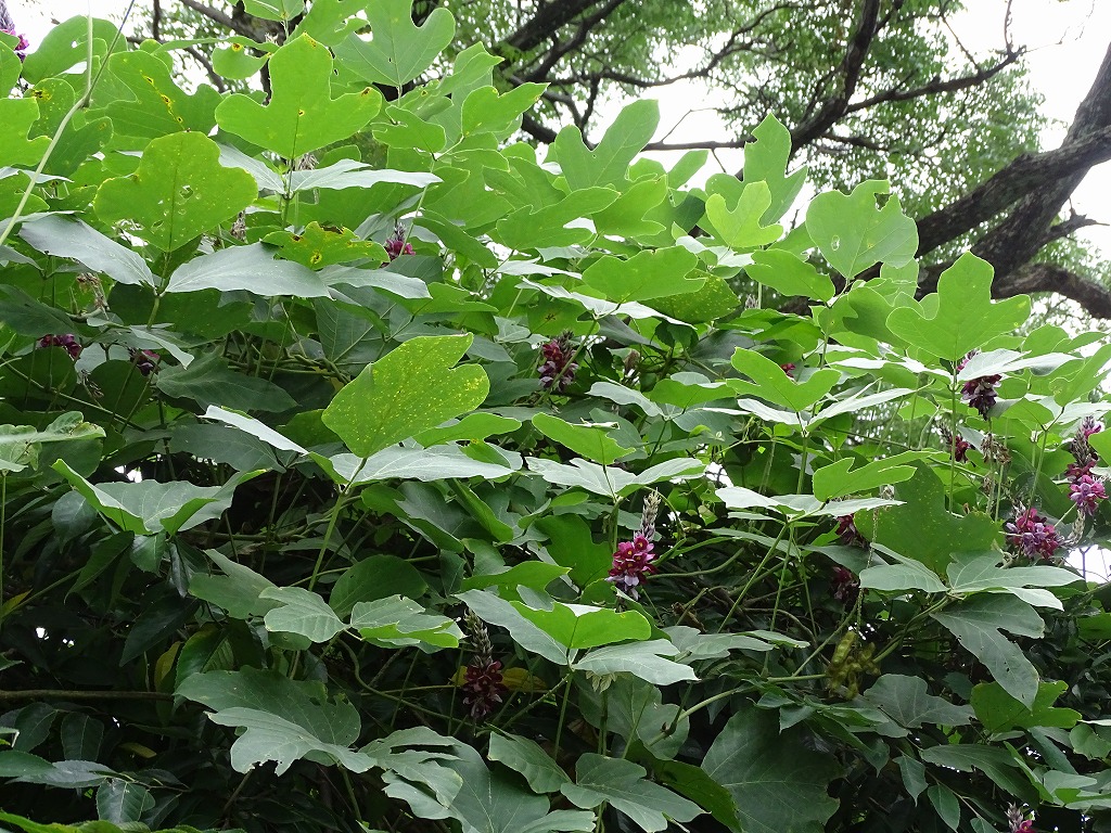 紫の花がきれいです。繁殖力が旺盛で、園路際までツルが伸びています。