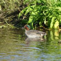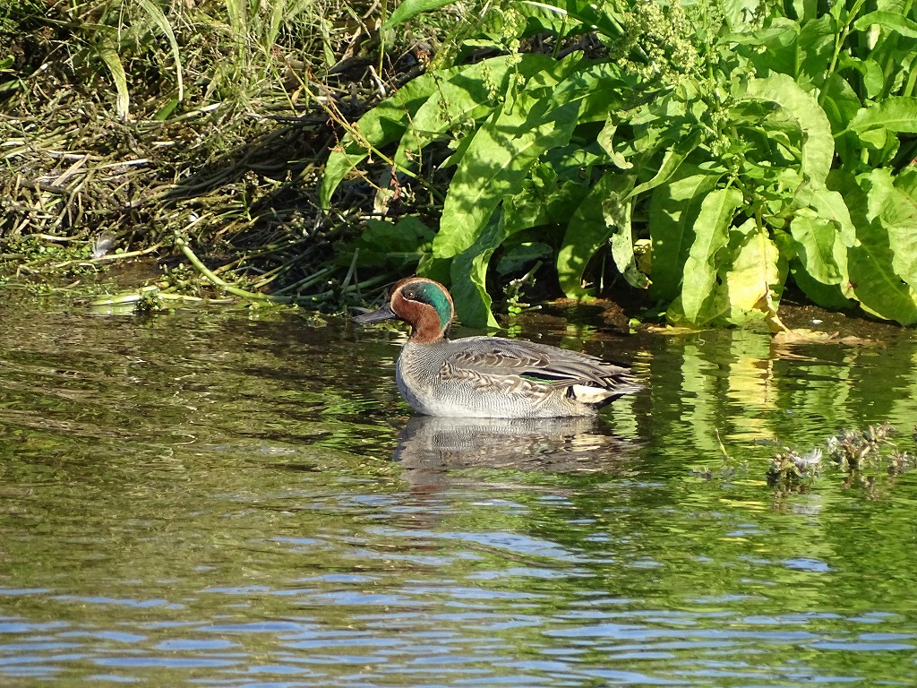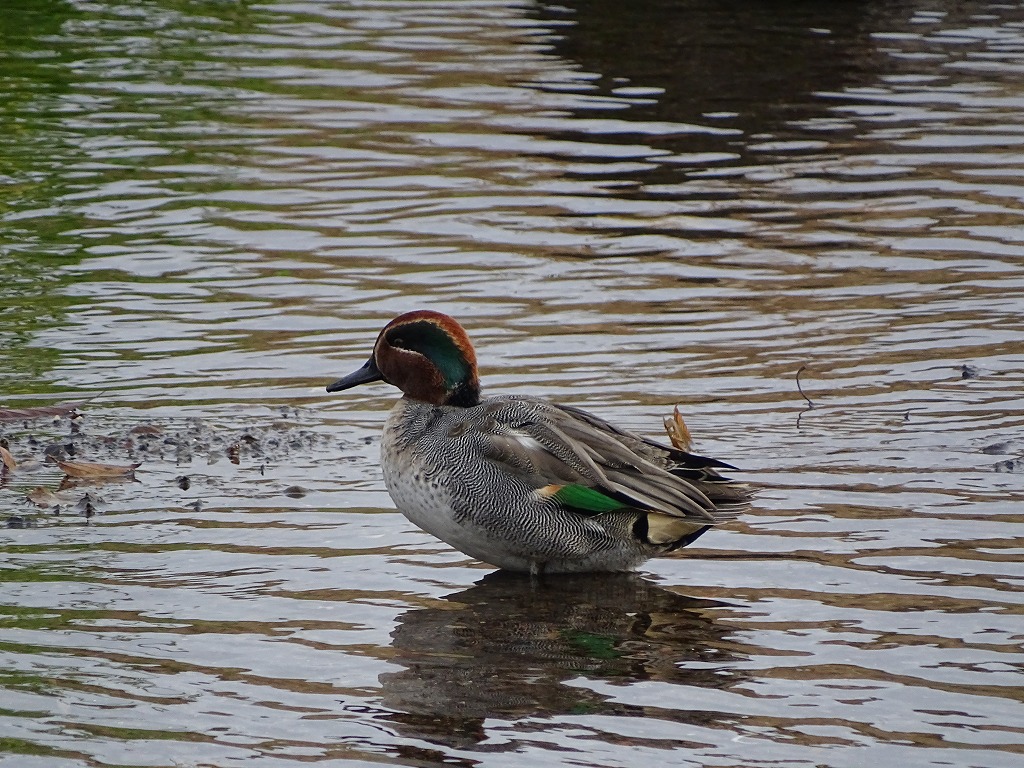 他のカモより一回り小さいので、コガモ。オスは、目のまわりが緑色をしていてとてもきれいです。