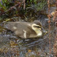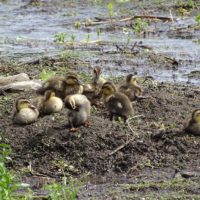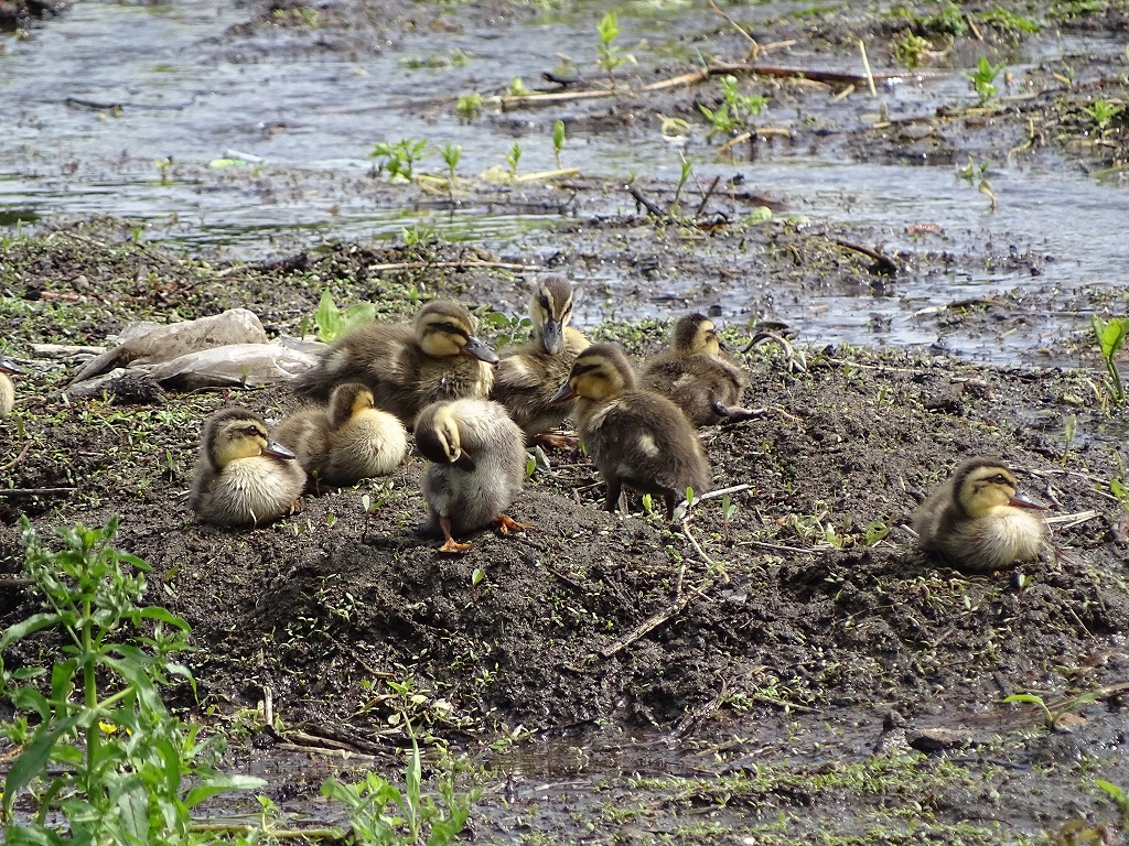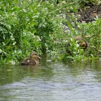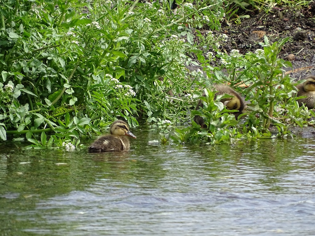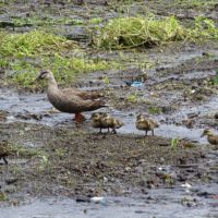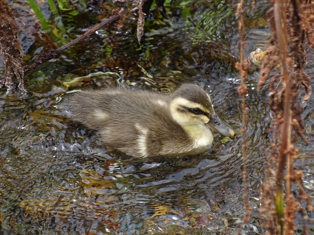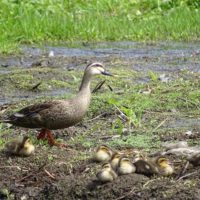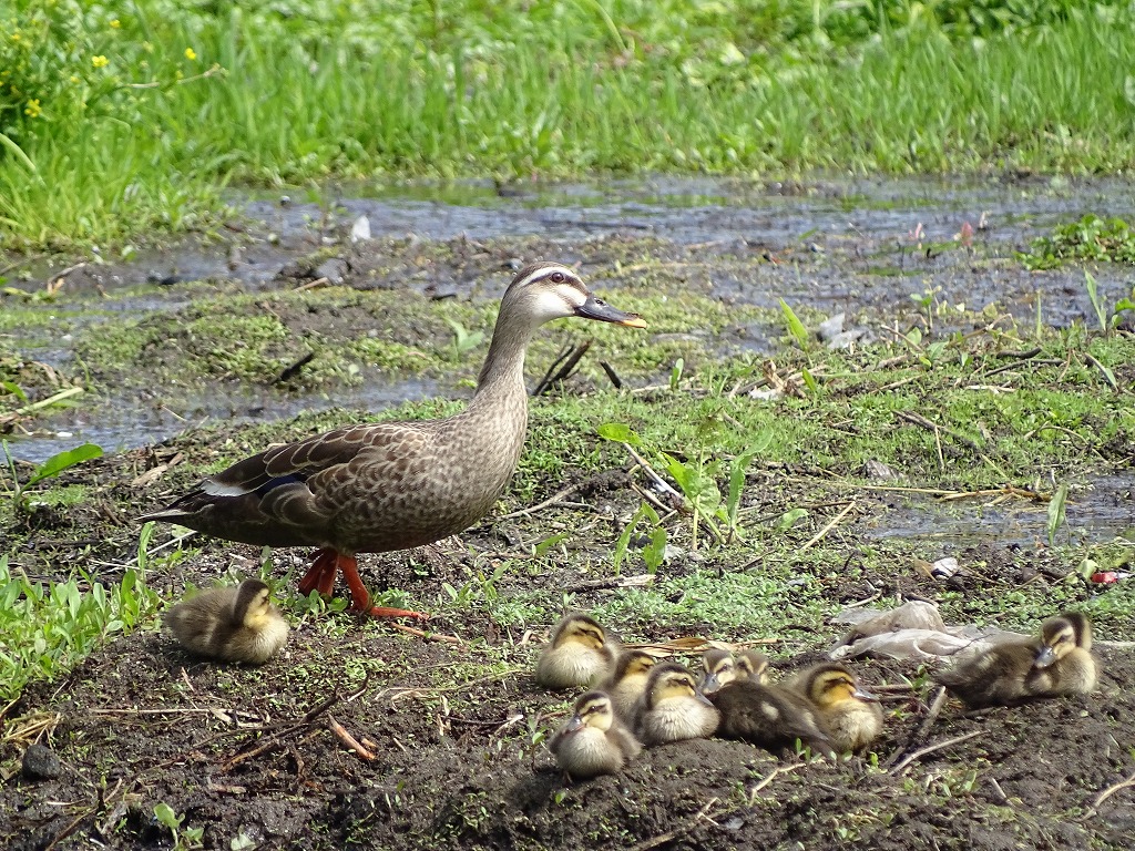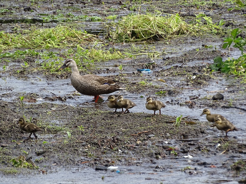 こんにちは、水前寺江津湖公園です。 園内でカルガモ親子を見かけました。カルガモは留鳥で、江津湖では年間通して観察できます。ときどきこのように江津湖で子どもを育てる風景を見ることができます。