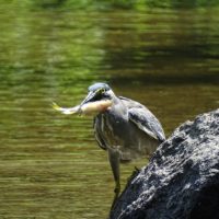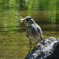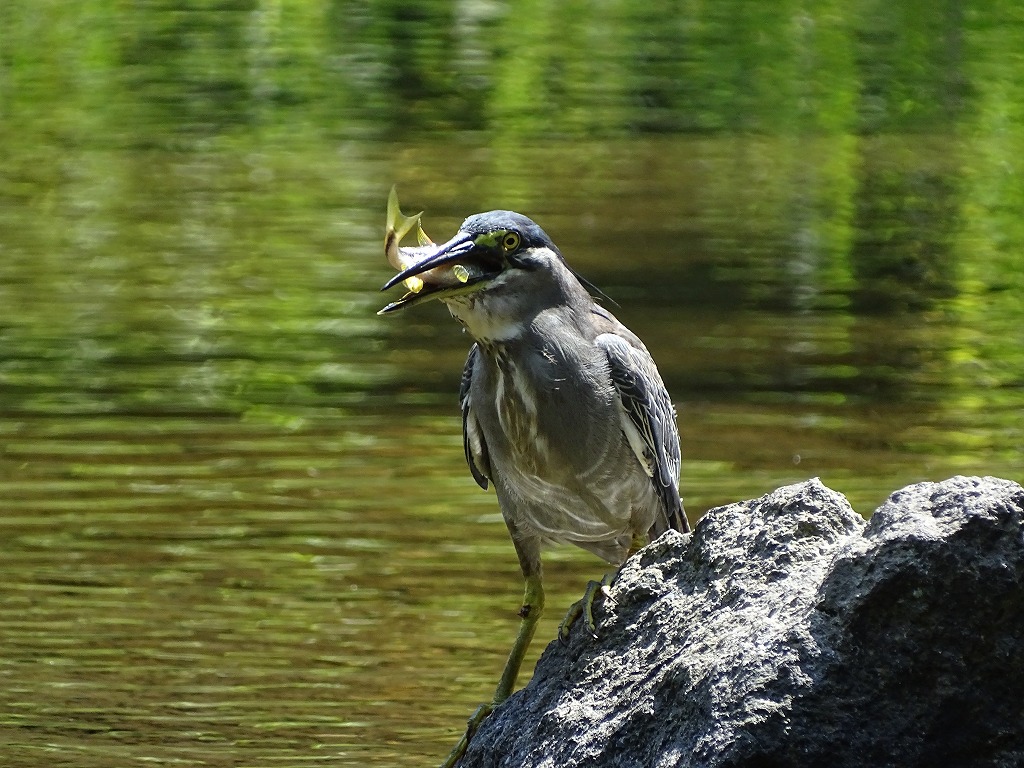 水面に飛び込んで大物をゲットしていました。上手ですね♪ ときどきササゴイは撒き餌漁を行ったりします。撒き餌漁とは、葉っぱや昆虫などを魚の餌に見立てて水面に浮かべ、寄ってくる魚を捕まえることです。 もし見かけたら紹介したいと思います。