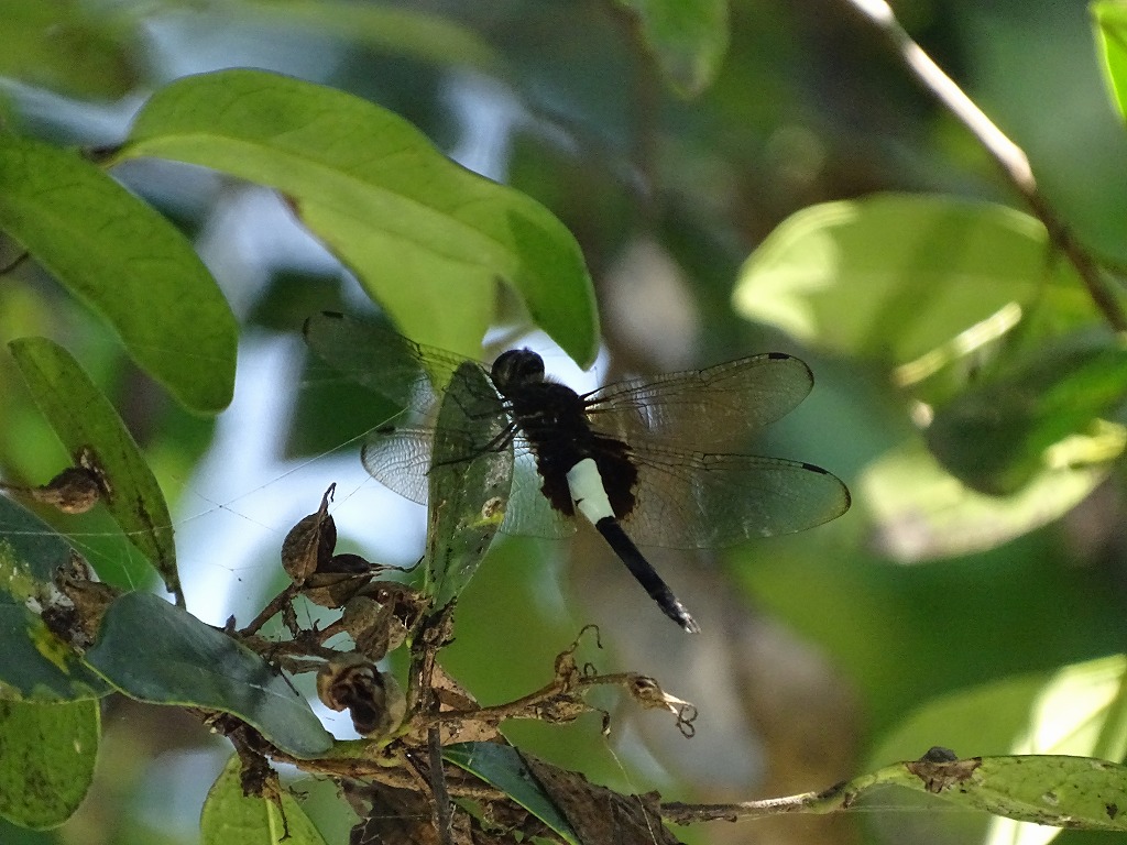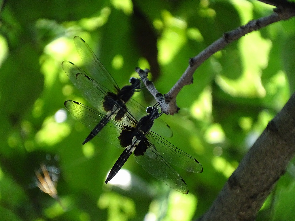 コシアキトンボを見かけます。 上空を見上げるとよく飛んでいるトンボです。体の真ん中部分にのみ模様があり、これが腰の部分が空いているように見えることから、コシアキトンボと名前が付けられたようです。オスは白く、メスは黄色です。 江津湖ではよく見かけますが、なかなかじっとしてくれないトンボです。