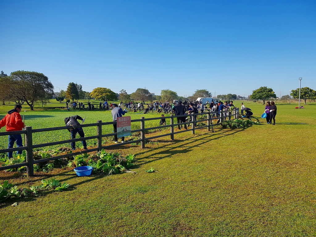 内容は、広木地区の池内のウォーターレタス(ボタンウキクサ)を主とする水草除去作業です。ウォーターレタスが池の水面を見せないほど覆いつくしています。非常に大変な作業ですが、HDUの皆様が快く清掃活動を引き受けて下さいました。