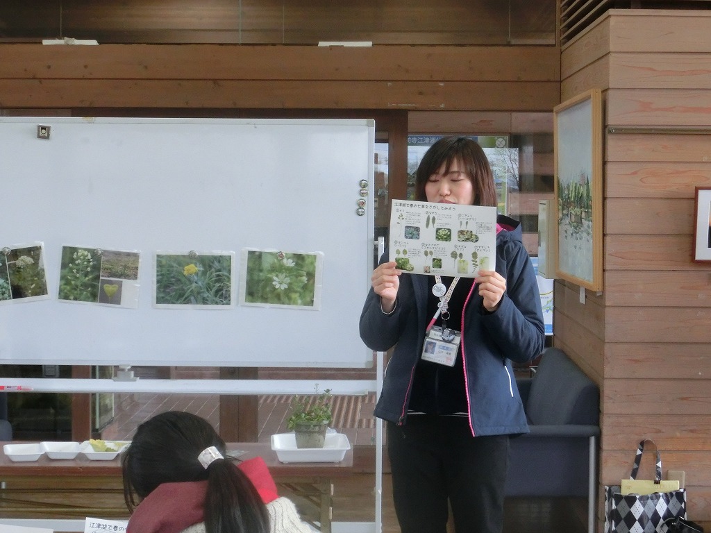 江津湖ではすずな(カブ)、すずしろ(ダイコン)以外の5種類が観察できます。みんな探せたかな?ちなみに春の七草とは、「せり(セリ)、なずな(ナズナ)、ごぎょう(ハハコグサ)、はこべら(ハコベ)、ほとけのざ(コオニタビラコ)、すずな(カブ)、すずしろ(ダイコン)」です。