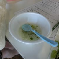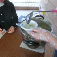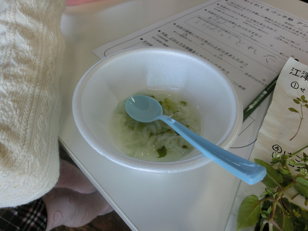 外での活動後は、七草がゆとはどういうものかを知っていただきたく、以前お店で仕入れていた七草を使っての七草がゆのふるまいです。