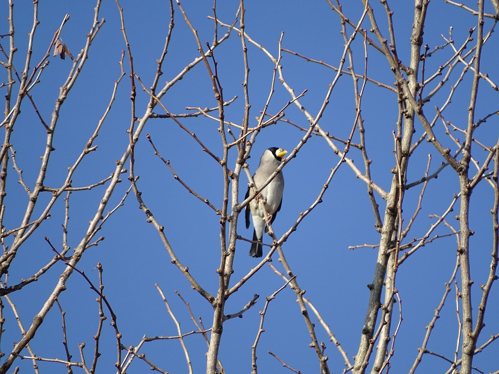 写真の野鳥はイカルといいます。今季はあまり見かけませんでしたが、ようやく集団で見かけるようになりました。 特徴的なくちばしですね。この大きいくちばしで、堅いエノキなどの実をパチパチ砕いて食べています。 鳴き声がきれいで、遠くから口笛を吹くような声が聞こえてきたら、それはイカルの鳴いている声だと思います。