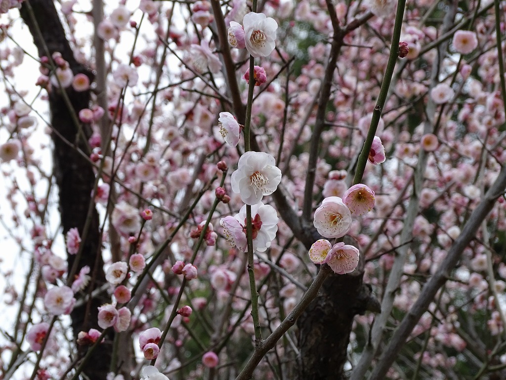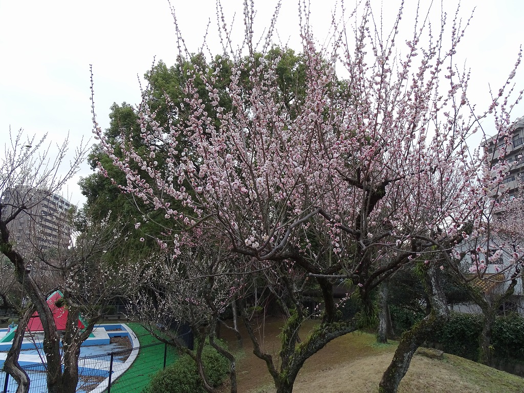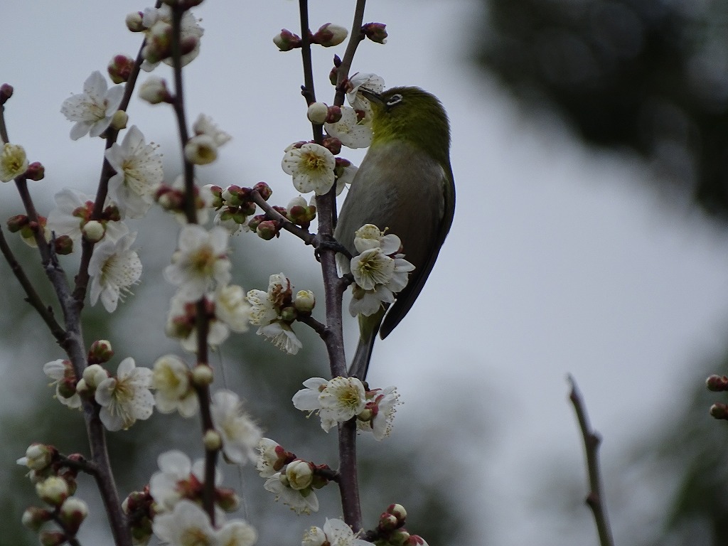白、ピンク、赤など色とりどりの花はとてもきれいです。近くを通るとよい香りが漂っています。ウメにメジロもよく見かけます。春が近づいてきていますね。