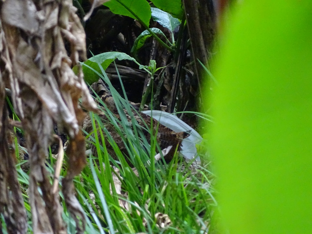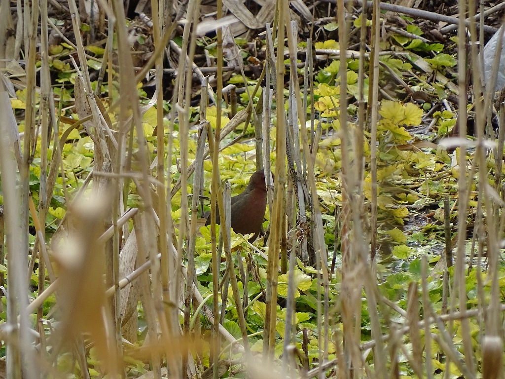 ヒクイナです。ヒクイナは、クイナ以上に姿を現さない野鳥です。たまたま見つけましたが、藪から出てこず、頭も隠れており、非常に分かりにくい写真となっています。