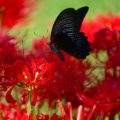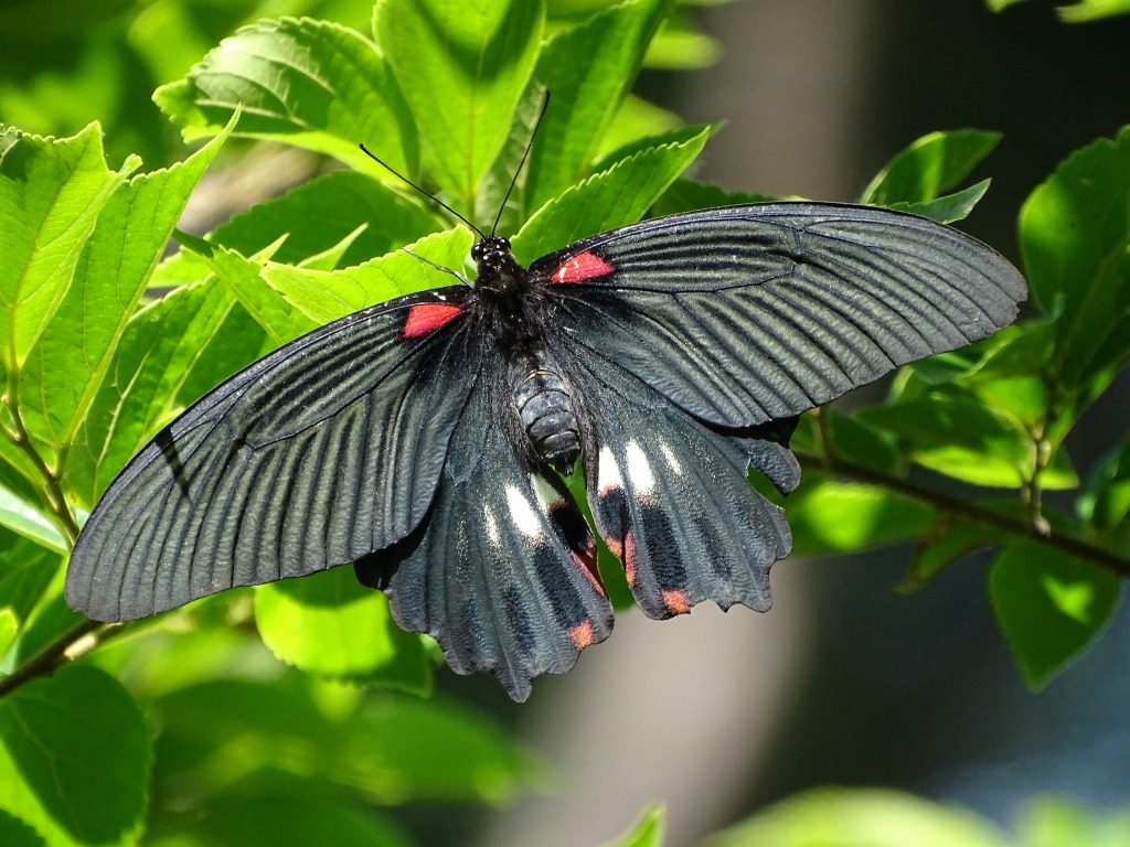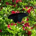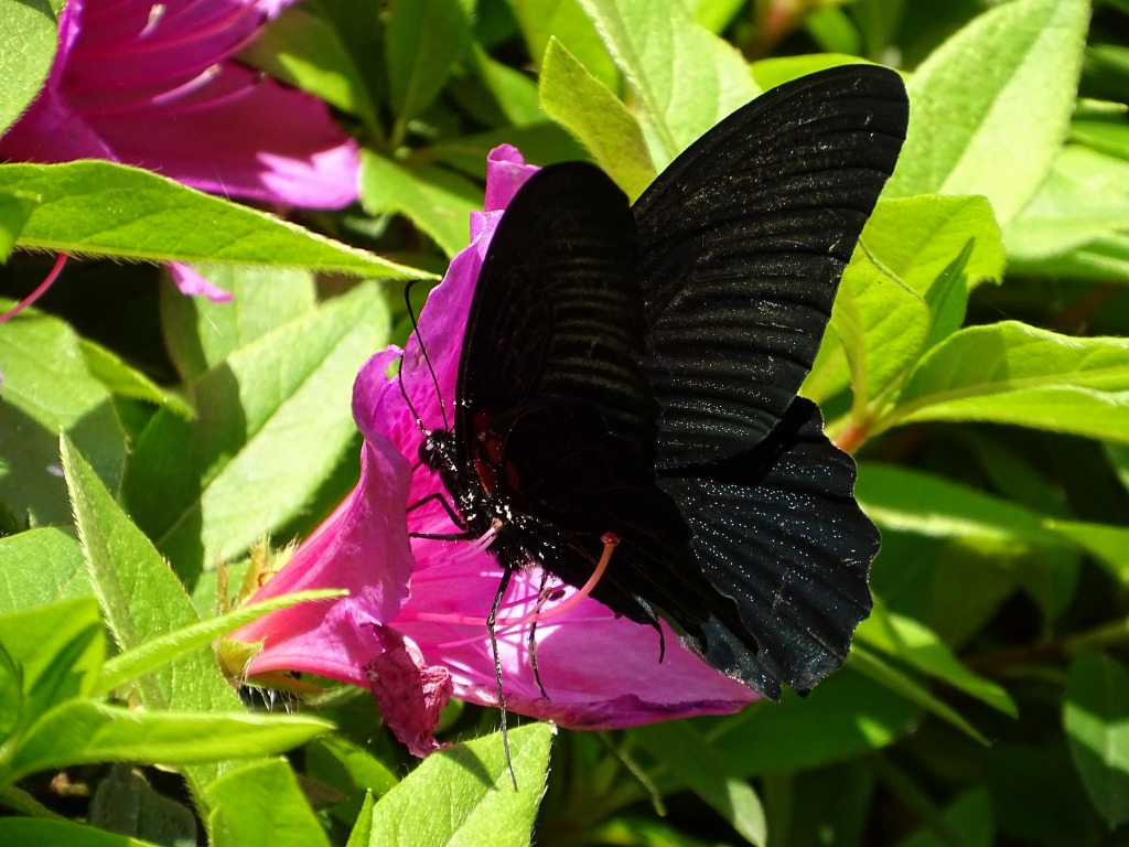 園内では黒いアゲハチョウがよく飛んでいます。写真のアゲハチョウはナガサキアゲハといいます。 よくクロアゲハという名前を聞きますが、黒いからといって全部がクロアゲハではございません。いろいろと見分ける必要があります。 ナガサキアゲハの特徴は、翅に尾状突起がないので、そこで他の黒いアゲハチョウと見分けることができます。