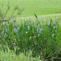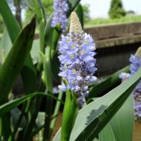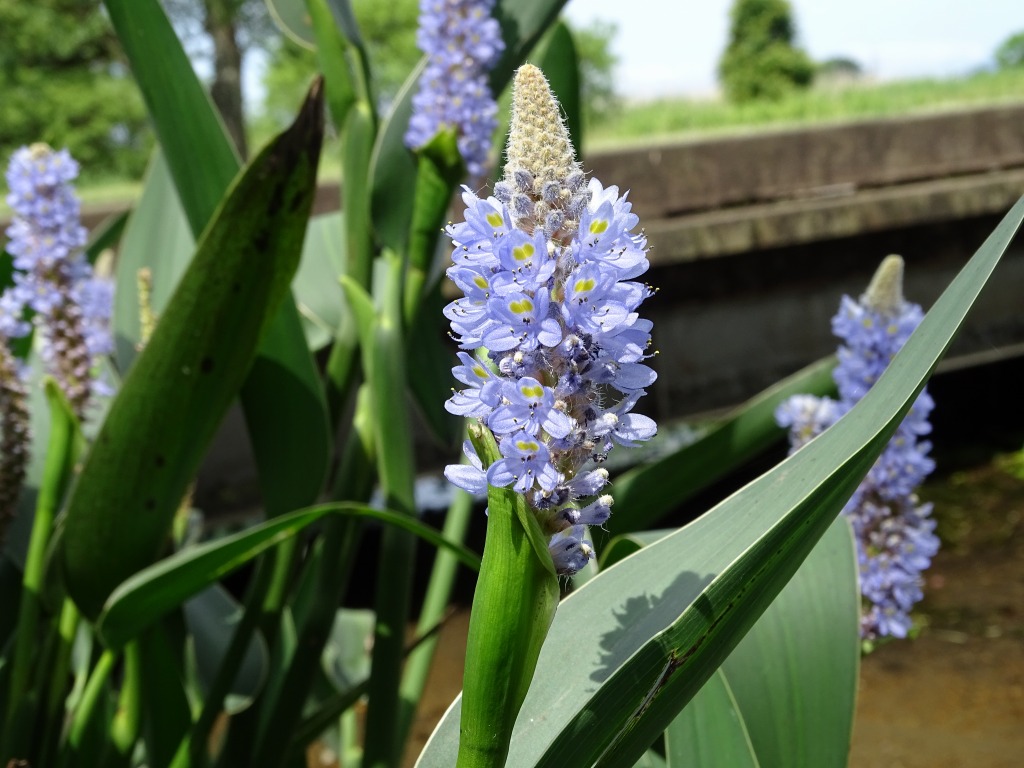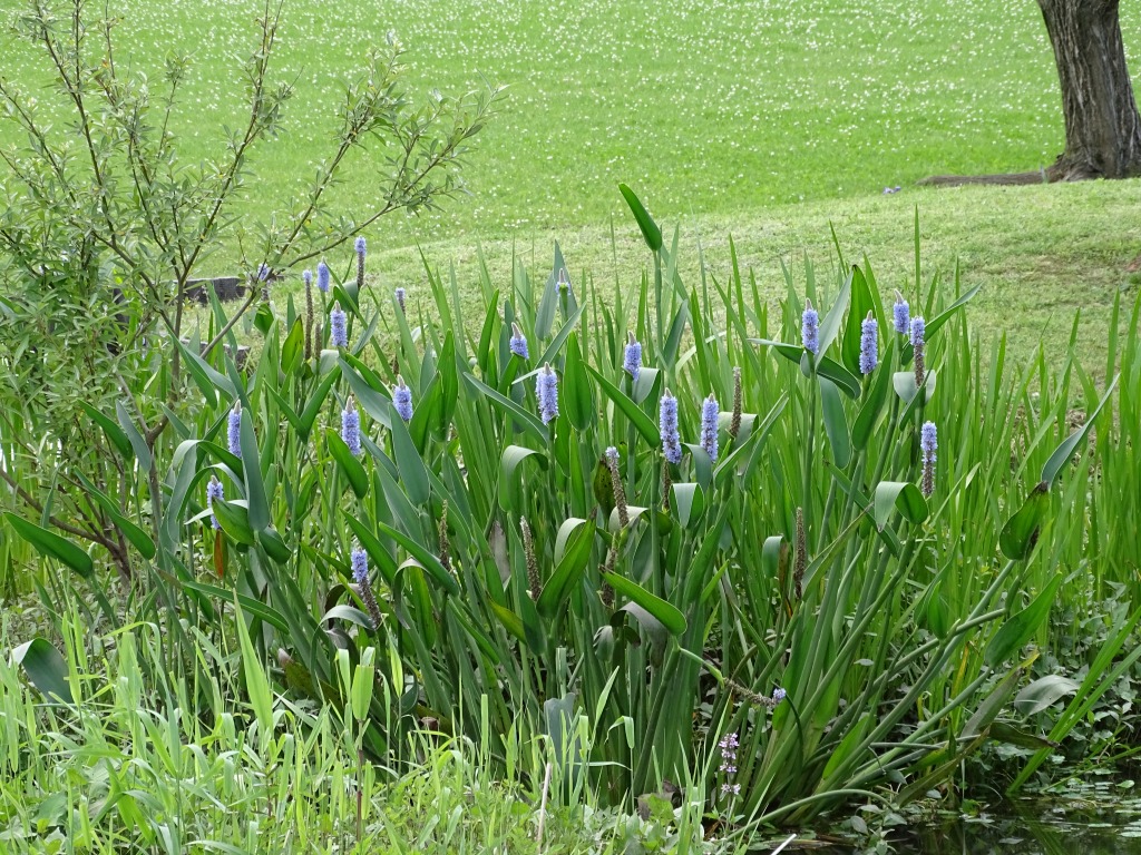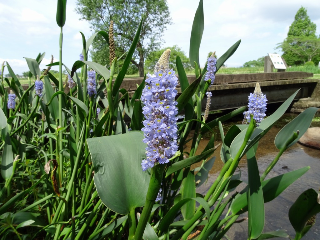 園内ではナガバミズアオイの花が咲き始めています。園内で保全活動を行っているミズアオイは在来種ですが、こちらは外来種となっており、別名ポンテデリアといいます。