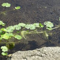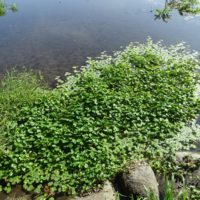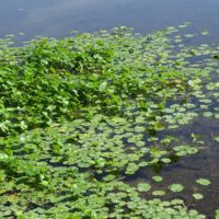 江津湖ではブラジルチドメグサよりももっと新しい外来植物で、ブラジルチドメグサとの違いは葉に切れ込みがないところです。ブラジルチドメグサと同じような繁茂の仕方をし、一部ではブラジルチドメグサと共存しています。